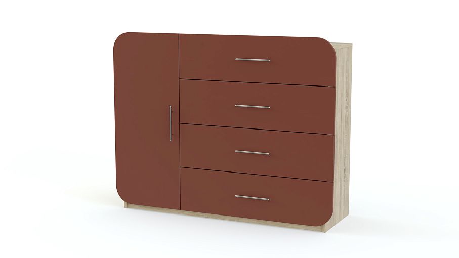 Комод Элиза 22 BMS дополнит современные интерьеры в стиле минимализм и хай-тек. Модель со скругленным по углам фасадом в ярком терракотовом цвете станет эффектным элементом дизайна и поможет вам разместить большое количество вещей. Удобная система хранения включает в себя распашное отделение с полкой и четыре широких выдвижных ящика, а для предметов декора или аппаратуры предусмотрена просторная столешница. Купить комод Элиза 22 BMS приглашаем в наш интернет-магазин по отличной цене.