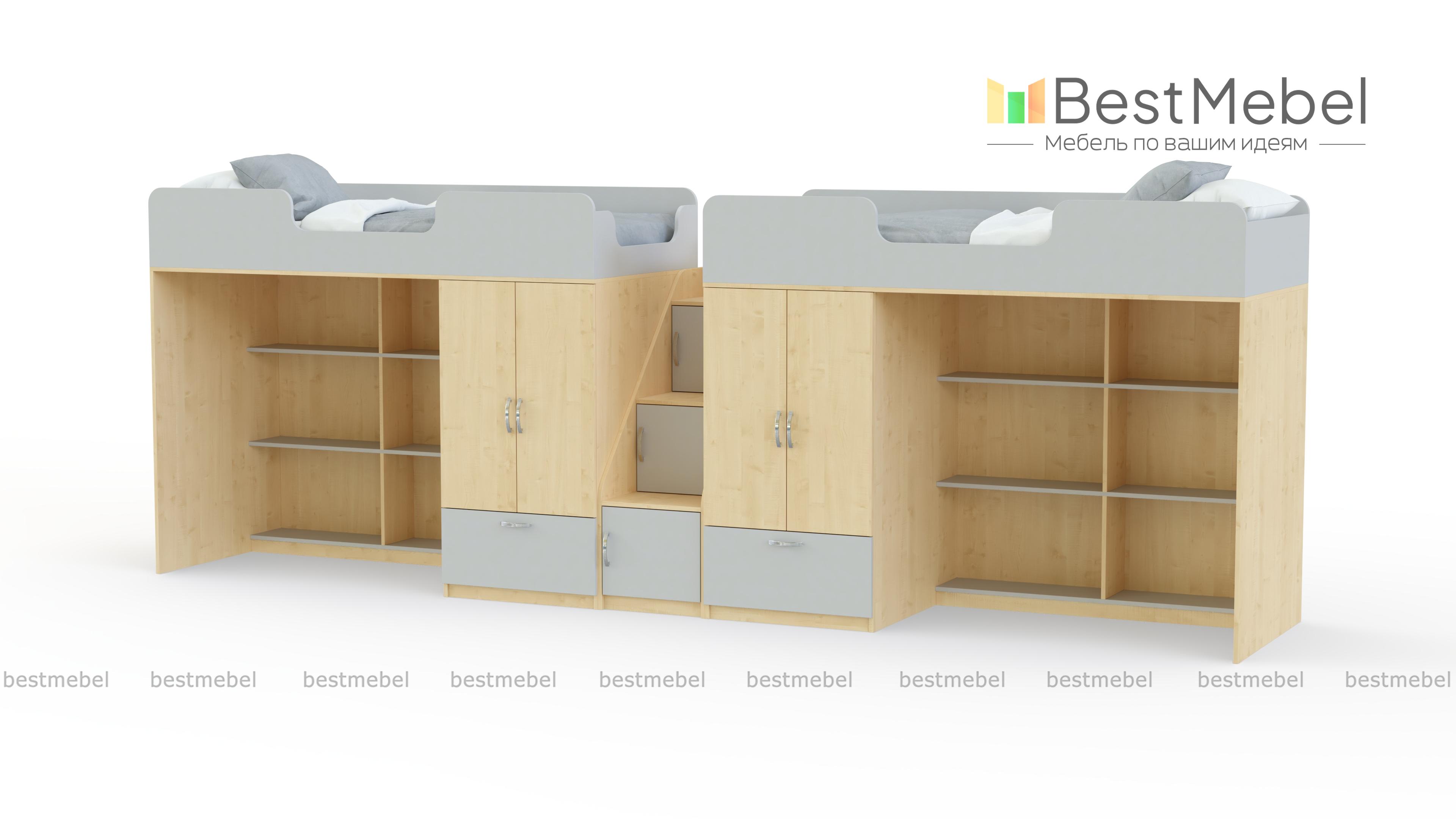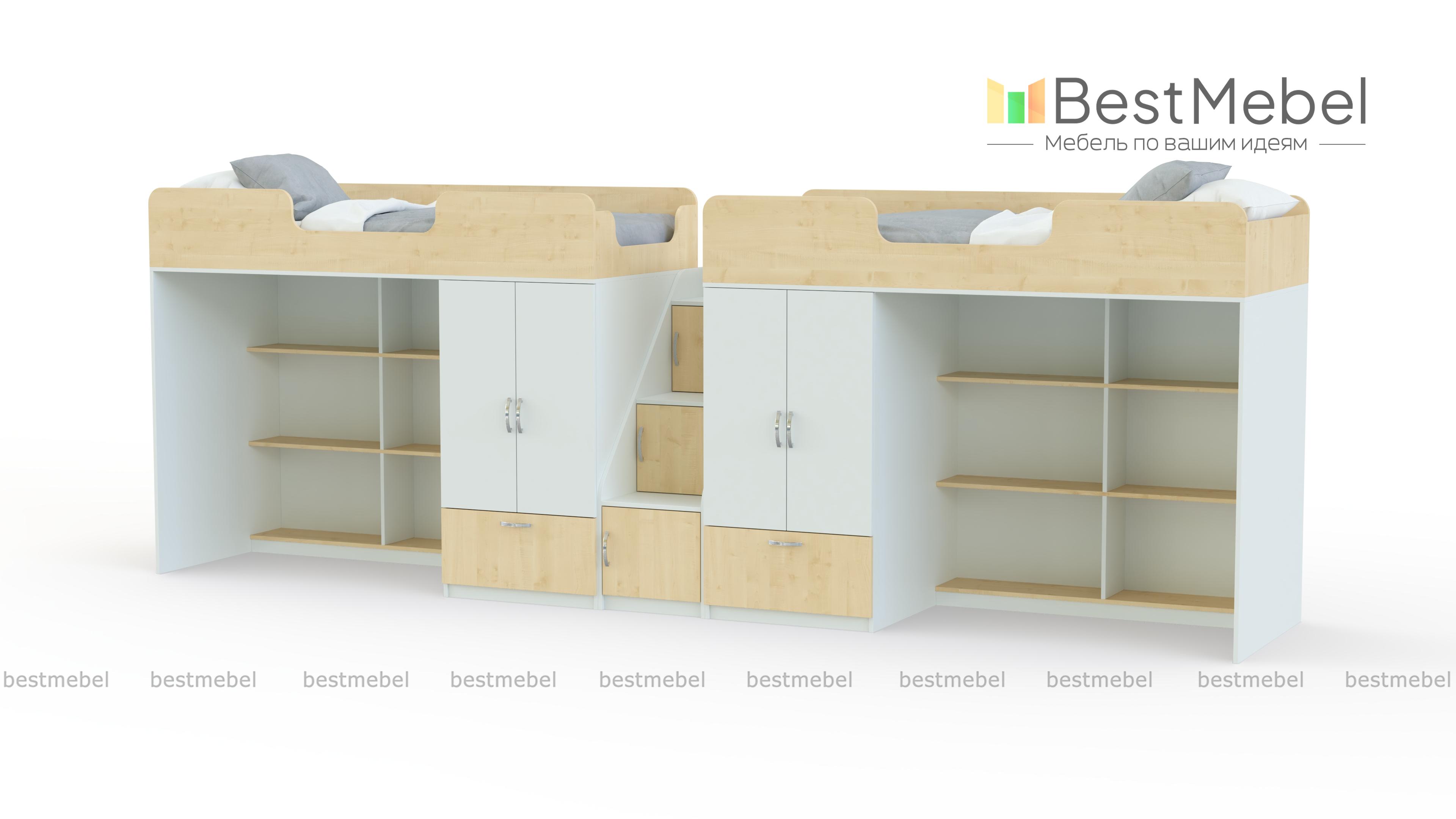 Двухъярусная кровать Миф 3.8 BMS позволит обеспечить двоих детей комфортными спальными местами и индивидуальными игровыми зонами. В комплект входят две кровати с защитными бортиками, просторные стеллажи для игрушек и книг в нишах и распашные двухдверные шкафчики со штангами для одежды и выдвижными ящиками. Дополнительные места для хранения – ящики под ступеньками приставной лестницы. Купить двухъярусную кровать Миф 3.8 BMS, подобрав оптимальный вариант расцветки, вы сможете в нашем интернет-магазине.