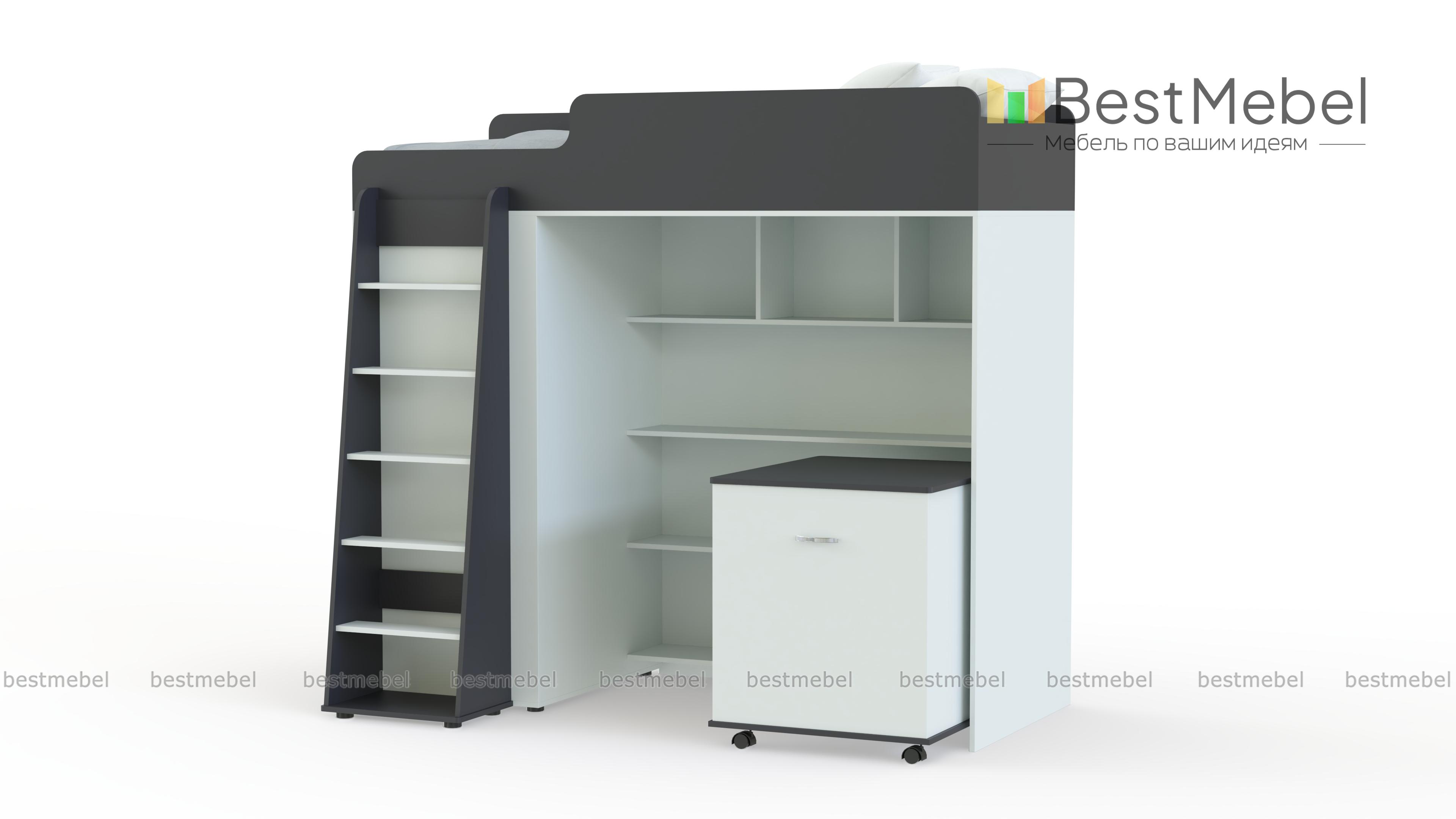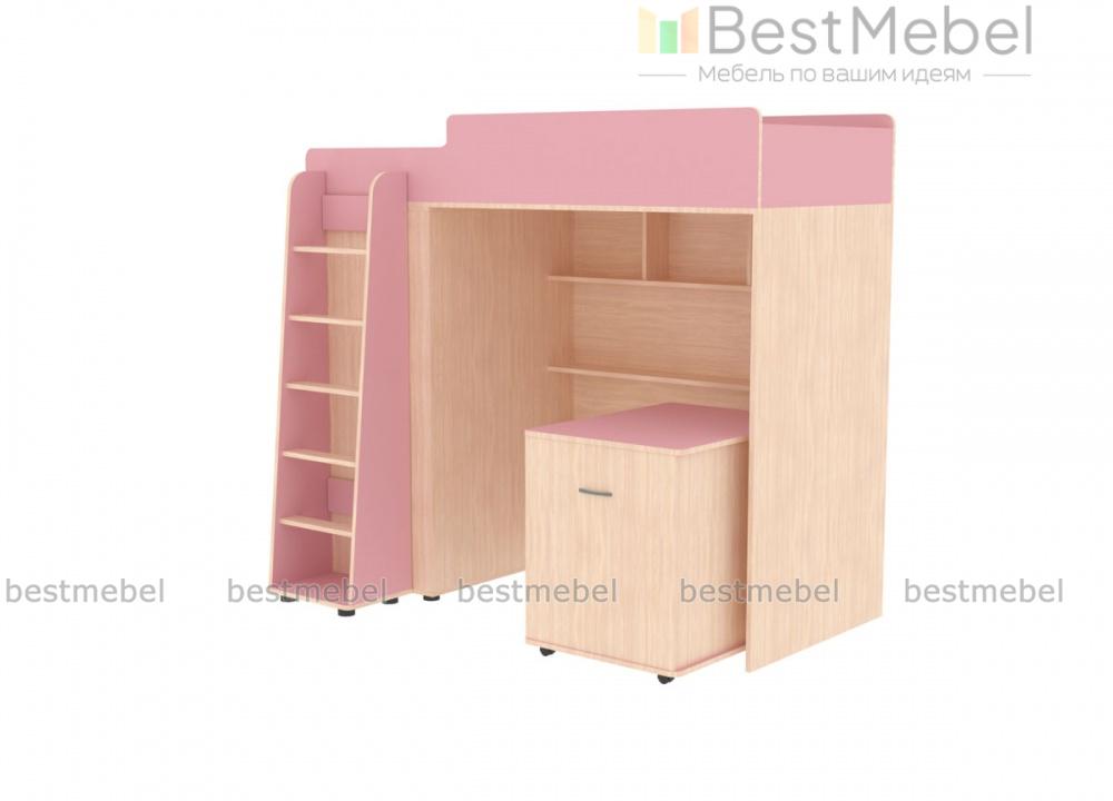Кровать-чердак Миф-5 BMS представляет собой практичную модульную композицию, незаменимую в малогабаритных помещениях. Спальное место второго яруса оборудовано скругленными защитными бортиками и дополнено приставной устойчивой лестницей. В нише первого яруса располагаются открытые книжные полки и тумба, а с торца разместился шкаф для одежды. Выполненная в сочетании светлых древесных тонов и белых вставок, кровать гармонично дополнит интерьер детской и порадует ребенка. Купить кровать-чердак Миф-5 BMS приглашаем в наш интернет-магазин по отличной цене.