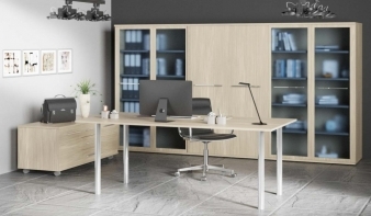 Кабинет руководителя Марио 2 BMS оборудован всем необходимым для размещения под рукой письменных принадлежностей, рабочих материалов, оргтехники и личных вещей. В комплект входят рабочий стол с отделенной от основания столешницей на хромированных опорах, мобильная сервисная тумба и комбинированный шкаф с застекленными распашными отделениями для документов и глухим – для одежды. Лаконичные и выполненные в древесных тонах, предметы гармонично вписываются в интерьер современного офиса. Купить кабинет руководителя Марио 2 BMS приглашаем в наш интернет-магазин.