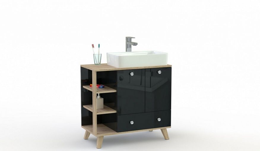 Тумба для ванной Данте 5 BMS выполнена в популярном скандинавском стиле, сочетая черный и светлые древесные тона. Пристенная тумба устойчива благодаря высоким скошенным опорам и оборудована двухдверным распашным отделением, широким выдвижным ящиком и открытыми торцевыми полками, которые легко разместят все необходимые под рукой аксессуары и уходовые средства. Модель со столешницей предназначена для установки раковин-чаш. Купить тумбу для ванной Данте 5 BMS вы сможете на сайте нашего интернет-магазина.