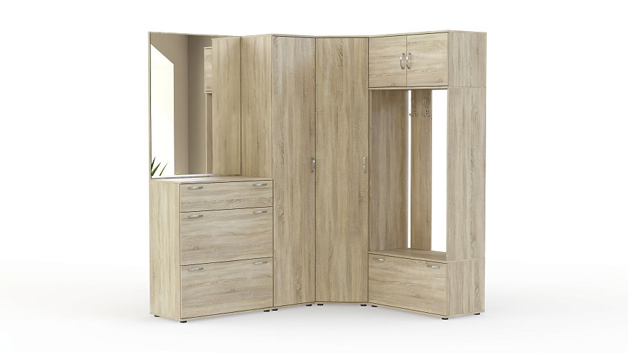 Прихожая Лацио 6 BMS отличается лаконичным современным дизайном и гармонично впишется в интерьеры разного типа. Угловая модель оборудована распашными шкафами для одежды, открытой вешалкой с антресолью и обувницей и большим зеркалом с тумбой. Особенность дизайна – фасады светлых древесных тонов. Простая и надежная конструкция в сочетании с износостойкими материалами станет гарантией долговечности и эстетичного внешнего вида. Купить прихожую Лацио 6 BMS вы сможете в нашем интернет-магазине.