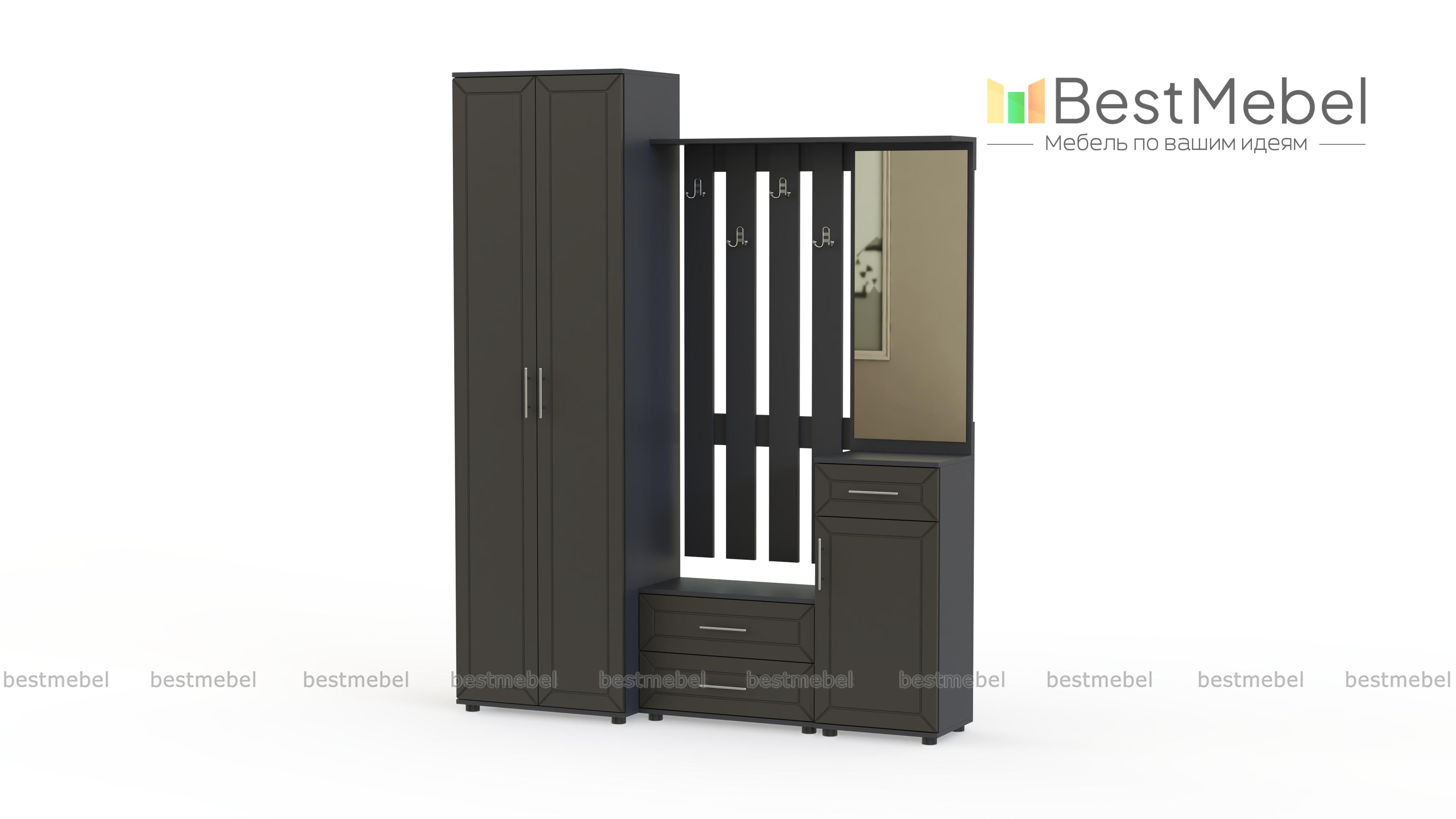 Прихожая Уют BMS с фрезерованными рамками на фасаде станет выбором тех, кто предпочитает классику. Простой и элегантный комплект включает в себя все необходимые комфортной входной зоне модули: платяной шкаф, открытую вешалку, зеркало и две тумбы – оборудованную двумя выдвижными ящиками низкую и высокую. Насыщенные темные оттенки наполнят комнату теплом и уютом. Купить прихожую Уют BMS вы сможете в нашем интернет-магазине, подобрав фурнитуру и цвет по каталогу.
