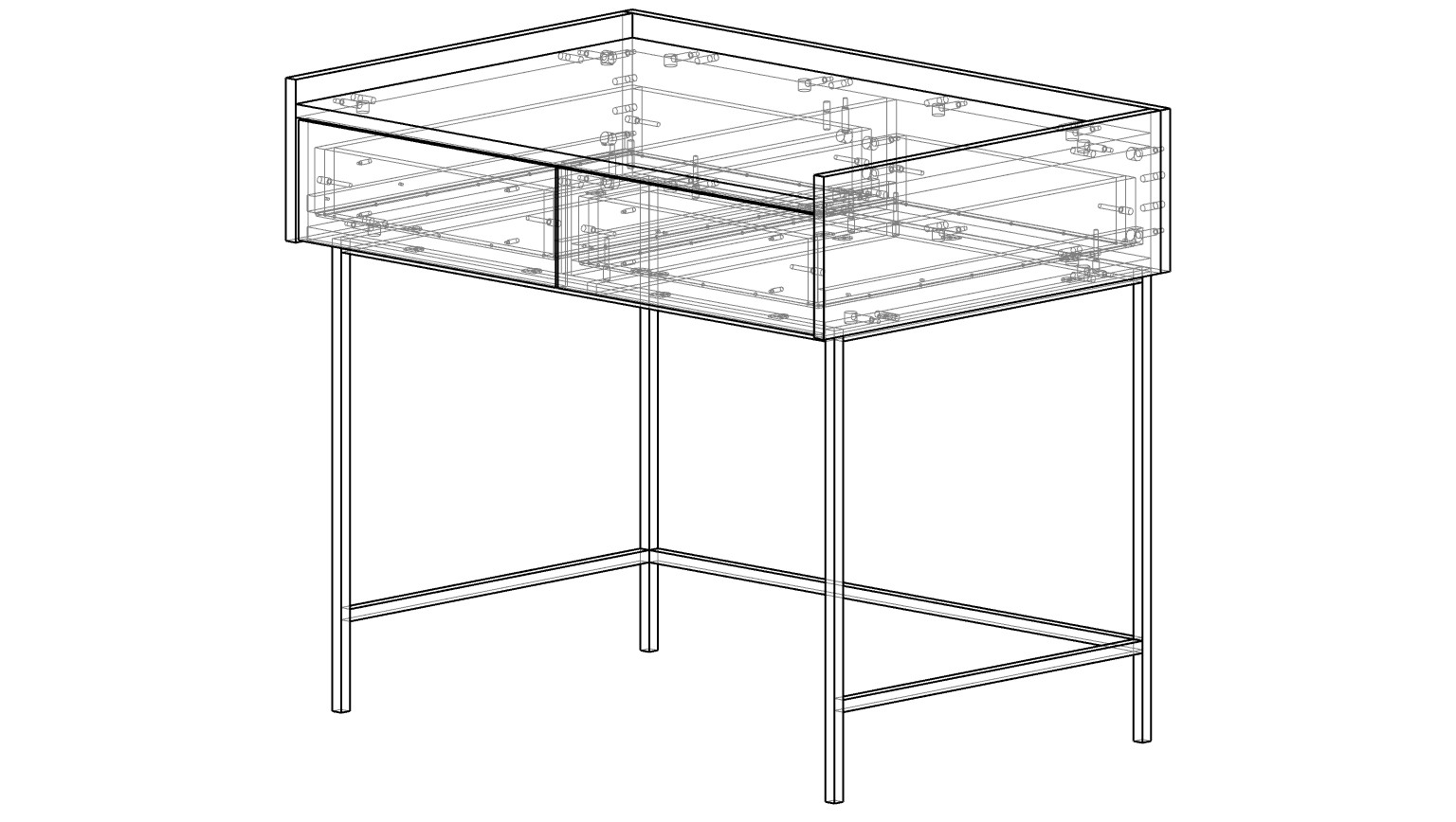 Стол располагается на металлическом каркасе в тон корпусу, визуально легком и прочном. Модель с широкой столешницей оборудована двумя выдвижными ящиками, для хранения бумаг и канцелярских мелочей.