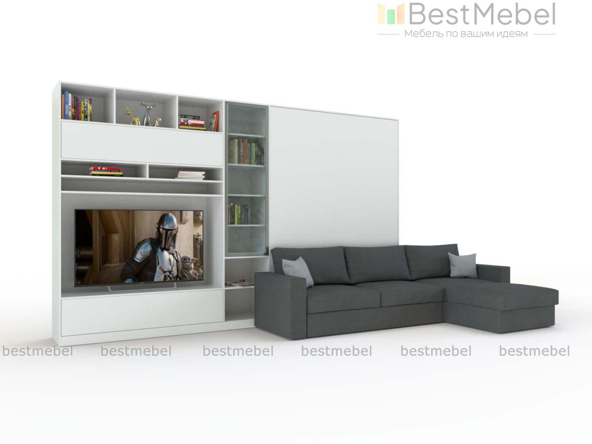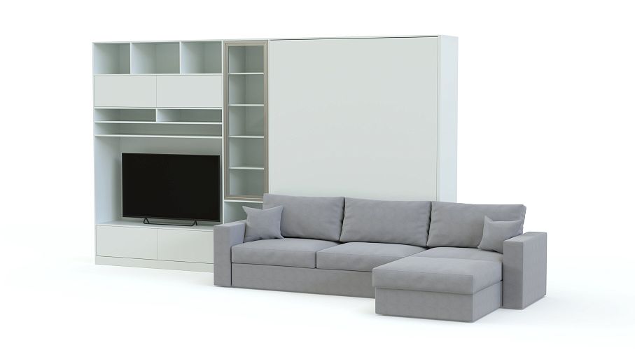 Шкаф-кровать с диваном Блэк BMS выполнен в модной монохромной гамме и гармонично впишется в интерьер просторной современной студии. Минималистичная композиция позволит рационально организовать пространство и вписать все необходимое комфортной зоне отдыха. Угловой комплект включает в себя секцию с тумбой, нишей под ТВ и антресольными полками, витрину, модуль с откидной кроватью и угловой диван-трансформер. Купить шкаф-кровать с диваном Блэк BMS и сделать пользование эргономичным вам поможет наш интернет-магазин.