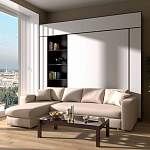 Шкаф-кровать Вера BMS – элегантное решение проблемы нехватки полезной площади. Минималистичная композиция 3 в 1 объединила угловой, совмещенный с оттоманкой, диван и шкаф, оборудованный открытыми полками и встроенной откидной кроватью с вертикальным механизмом подъема. Эффектный вид модели придает сочетание белого оттенка фасада с контрастным древесным кантом и светлой обивкой. Купить шкаф-кровать Вера BMS для небольшой гостиной или современной студии приглашаем в наш интернет-магазин.