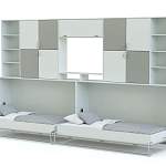 Шкаф-кровать трансформер Энни BMS – это многофункциональная линейная композиция, которая станет практичным решением для комнаты двоих детей. Стенка современного дизайна оборудована удобной системой хранения, включающей в себя распашные отделения, открытые полки и нишу под ТВ, а в нижней части располагаются модули с откидными кроватями. Благодаря горизонтальному механизму раскладывания модель оптимальна для узких помещений, значительно экономя пространство. Купить шкаф-кровать трансформер Энни BMS, выполненный в спокойной бело-зеленой гамме, приглашаем в наш интернет-магазин.