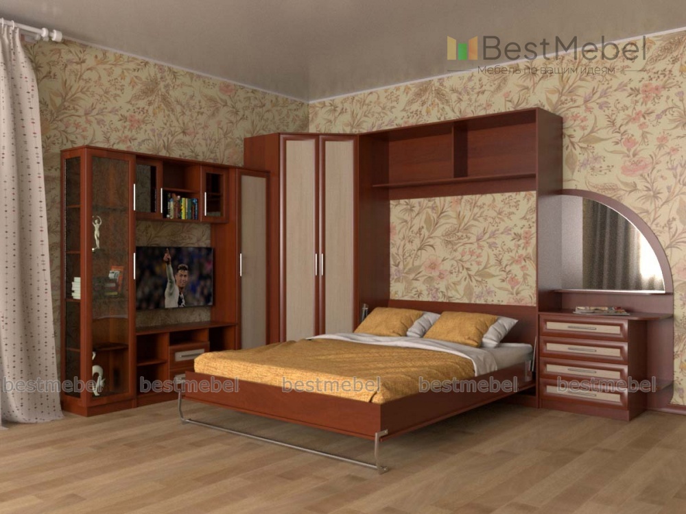 Шкаф-кровать трансформер Майя 15 BMS – это элегантная комбинации гостиной и спальни в интерьере малогабаритной квартиры. Угловая композиция оборудована секцией с тумбой под ТВ, изящной витриной, пеналом и шкафом-трапецией для одежды, а практичным дополнением станут откидная кровать, скрытая в нише за дверцами-книжкой, и тумба с фигурно вырезанным зеркалом в роли туалетного столика. Модель с классическими рамочными фасадами выполнена в древесных тонах, зеркальные поверхности декорированы пескоструйным рисунком. Купить шкаф-кровать трансформер Майя 15 BMS приглашаем в наш интернет-магазин.