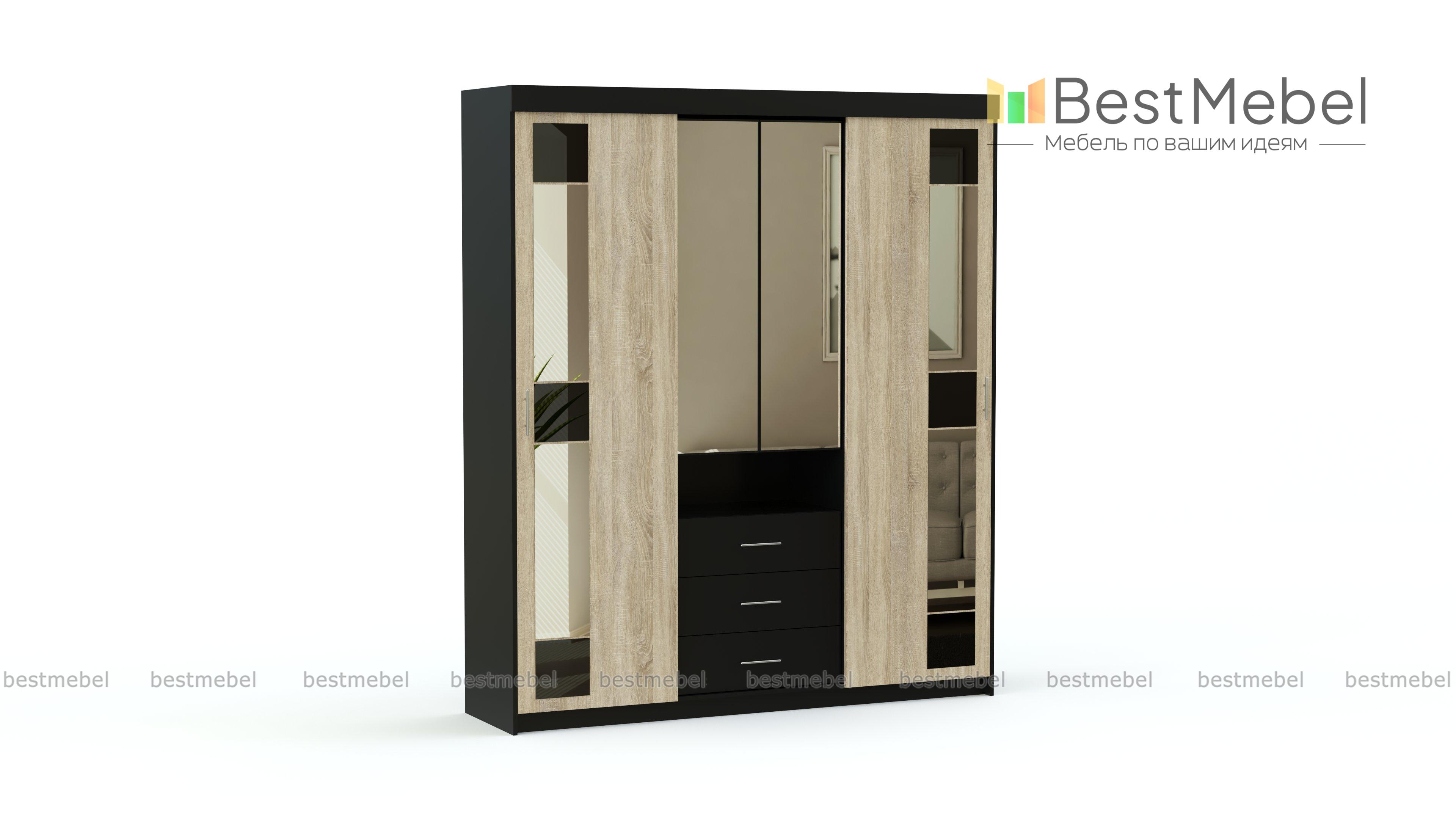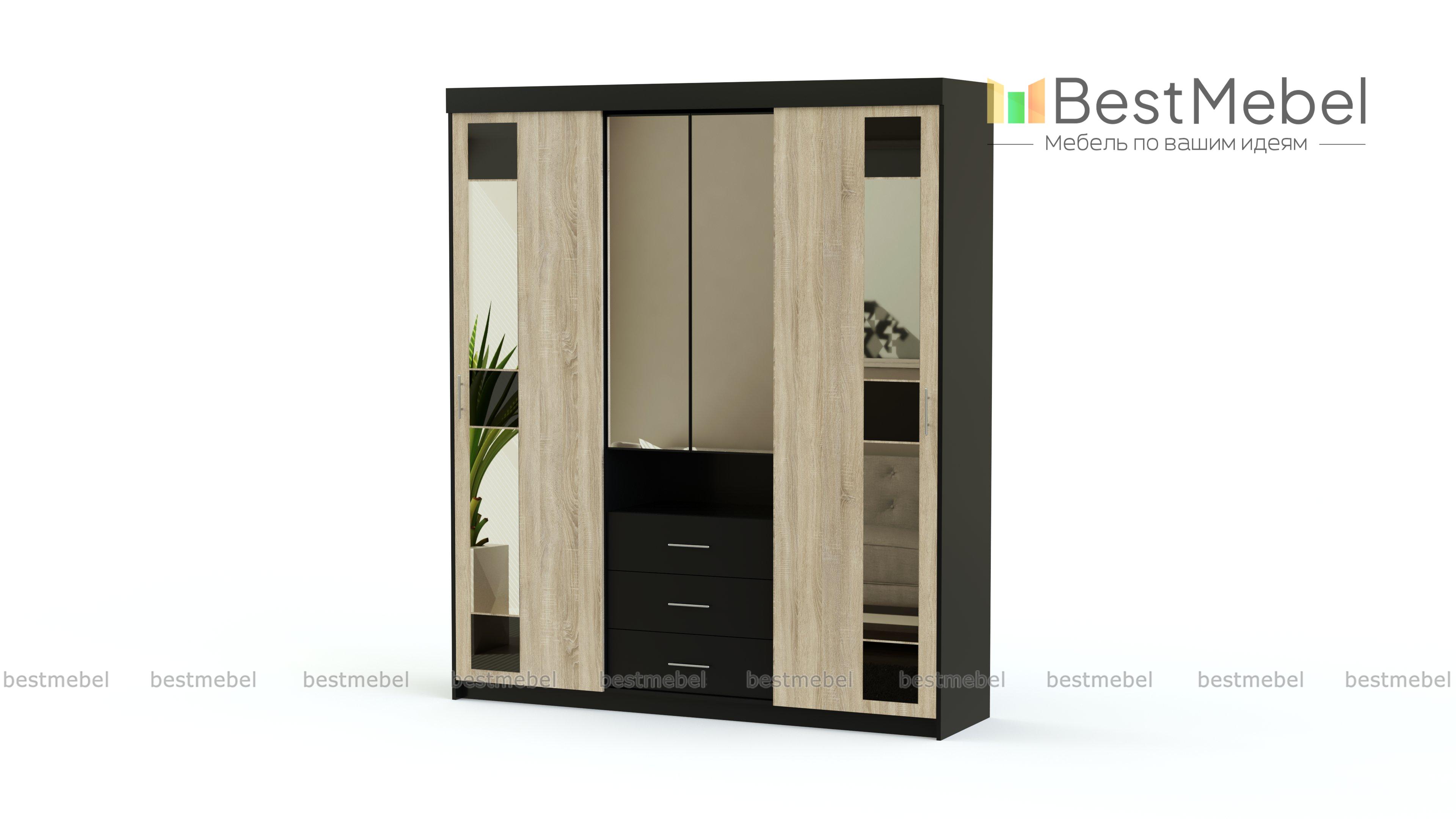 Шкаф-купе Бруклин BMS оценят по достоинству те, кому важны простой элегантный дизайн, надежность и функциональность. Вместительная модель выполнена в контрастных тонах с геометричным декором из зеркальных и темных стеклянных вставок. За боковыми раздвижными дверцами располагаются полки и штанга, центральная часть – оригинальная комбинация зеркального шкафчика, ниши и выдвижных ящиков для мелких вещей. Купить шкаф-купе Бруклин BMS по лучшей цене приглашаем в наш интернет-магазин.
