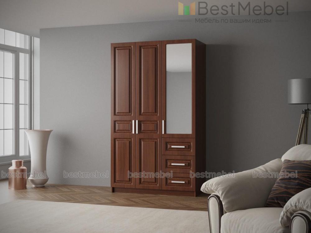Шкаф 3-х створчатый Визит модуль 07 BMS отличается классическим дизайном и высокой функциональностью. Оригинальная модель в теплых терракотовых тонах станет частью интерьера прихожей, гостиной или спальни. Шкаф оборудован распашным отделением с антресолью и штангой и дополнительной секцией с зеркальным шкафчиком и тремя выдвижными ящиками. Фрезерованные фасады дополнены изящными ручками-скобами. Купить шкаф 3-х створчатый Визит модуль 07 BMS по отличной цене вы сможете в нашем интернет-магазине.
