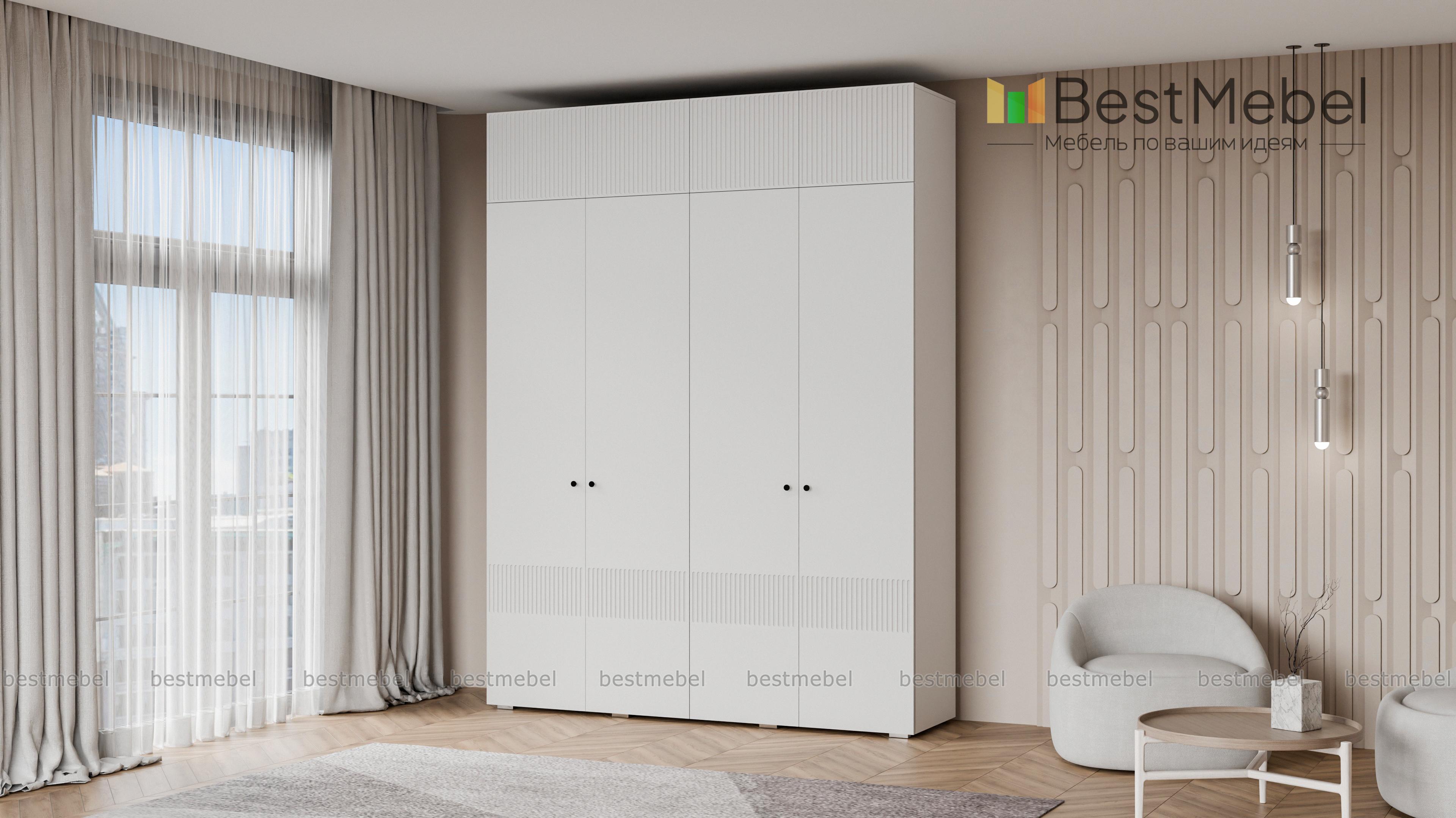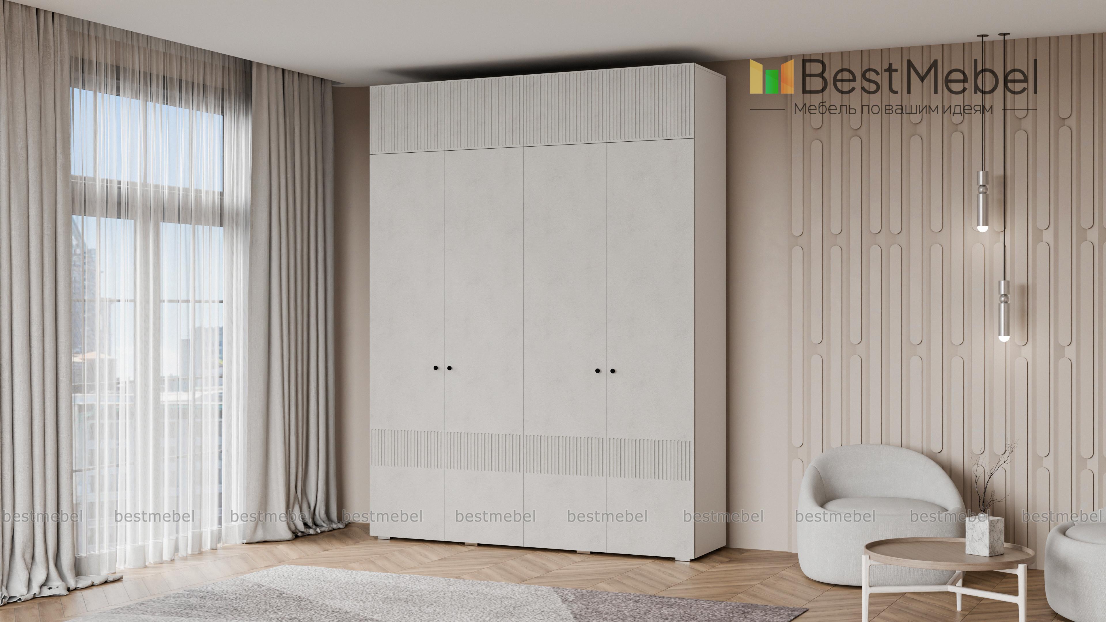 Шкаф распашной Джосс 10 BMS с четырьмя дверцами и антресолью можно разместить в разных комнатах: небольших спальнях, прихожих и детских. Оригинальные оттенки корпуса и фасада создают комфортную атмосферу в помещении, стильный акцент в отделке — фрезерованный орнамент. За дверцами справа скрыты штанга и полка, а слева — узкая платяная секция и бельевой стеллаж. Купить шкаф распашной Джосс 10 BMS с выбором размеров, цвета и фурнитуры вы сможете недорого в нашем интернет-магазине.