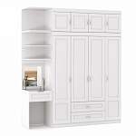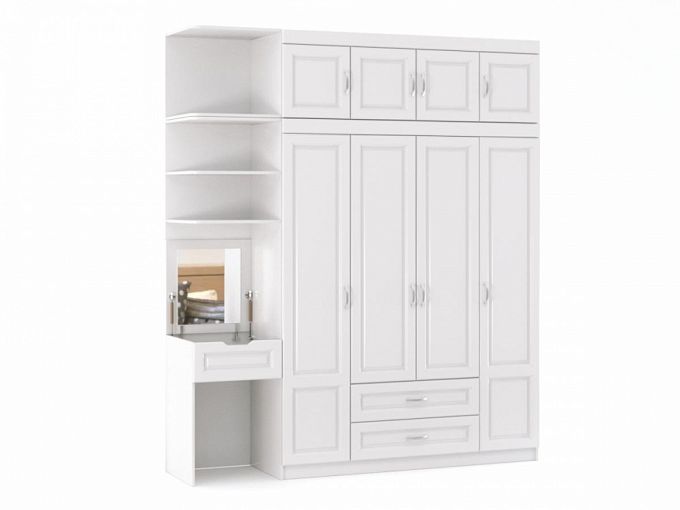 Шкаф со столом Лея 3 BMS обеспечит значительную экономию полезной площади, объединив удобную систему хранения для предметов гардероба и бытовых вещей с туалетным столиком. Четырехдверный шкаф с антресолью и выдвижными ящиками дополнен открытыми торцевыми полками, столиком с откидной столешницей и отсеком для мелочей и банкеткой. Выполненная в нейтральном белом цвете с рамочной фрезеровкой, модель визуально облегчает интерьер. Купить шкаф со столом Лея 3 BMS приглашаем к нам в интернет-магазин.