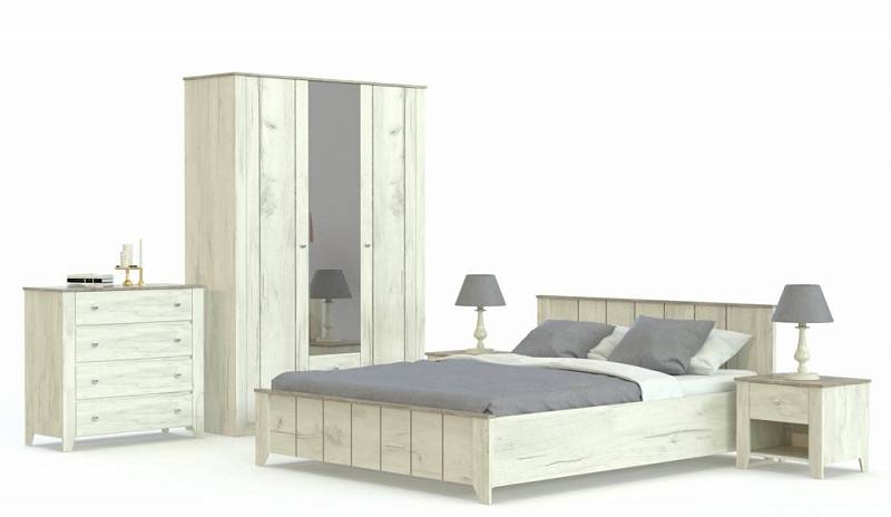 Простой и романтичный комплект в модном стиле прованс добавит вашей комнате легкости и простора. Спальня Элен 1 BMS состоит из нескольких модулей, выполненных в светлых тонах с тиснением на фасадах, контрастной отделкой и изящной фурнитурой. Это комфортная двуспальная кровать с тумбами на высоких ножках, комод с широкой столешницей и вместительный комбинированный шкаф для белья и одежды с зеркалом. Порадует вас и доступная на элегантную модель цена в нашем интернет - магазине.