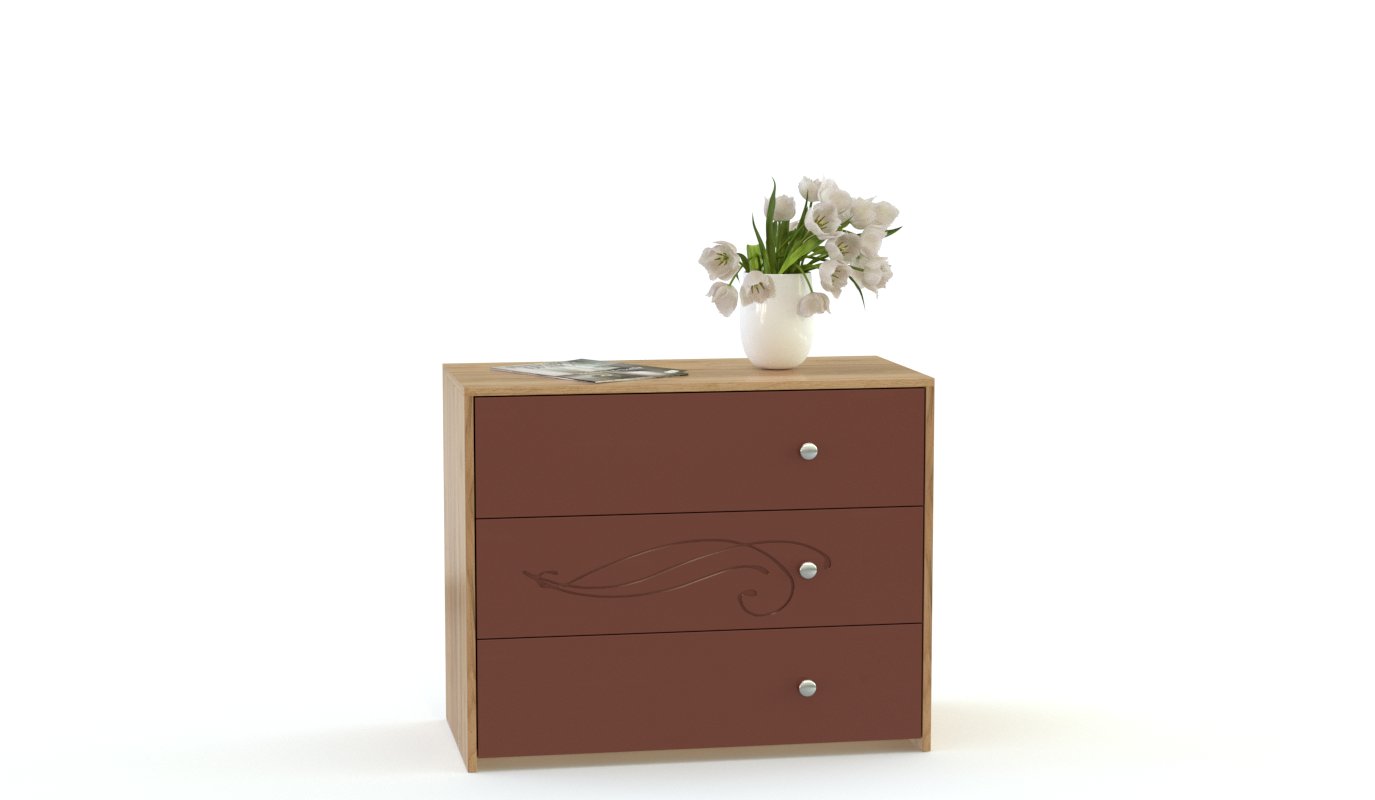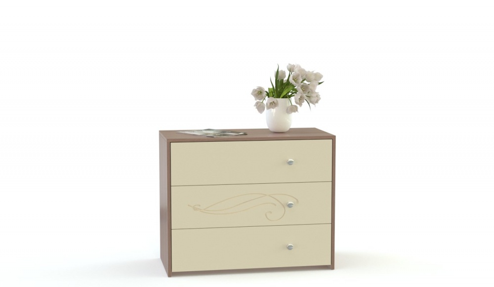 Современный модульный комплект совмещает функциональность, удобство компоновки отдельных элементов и эстетичный внешний вид. Помимо кровати с приставной тумбой и вместительного шкафа-купе с зеркальной дверью, в комплект входят два типа комодов – классический с выдвижными ящиками и совмещенный с зеркалом и открытыми полками. Интересны дизайнерские решения в отделке спальни Элика BMS – контрастная расцветка, изящные фигурные ручки и нанесенный на фасады рисунок.