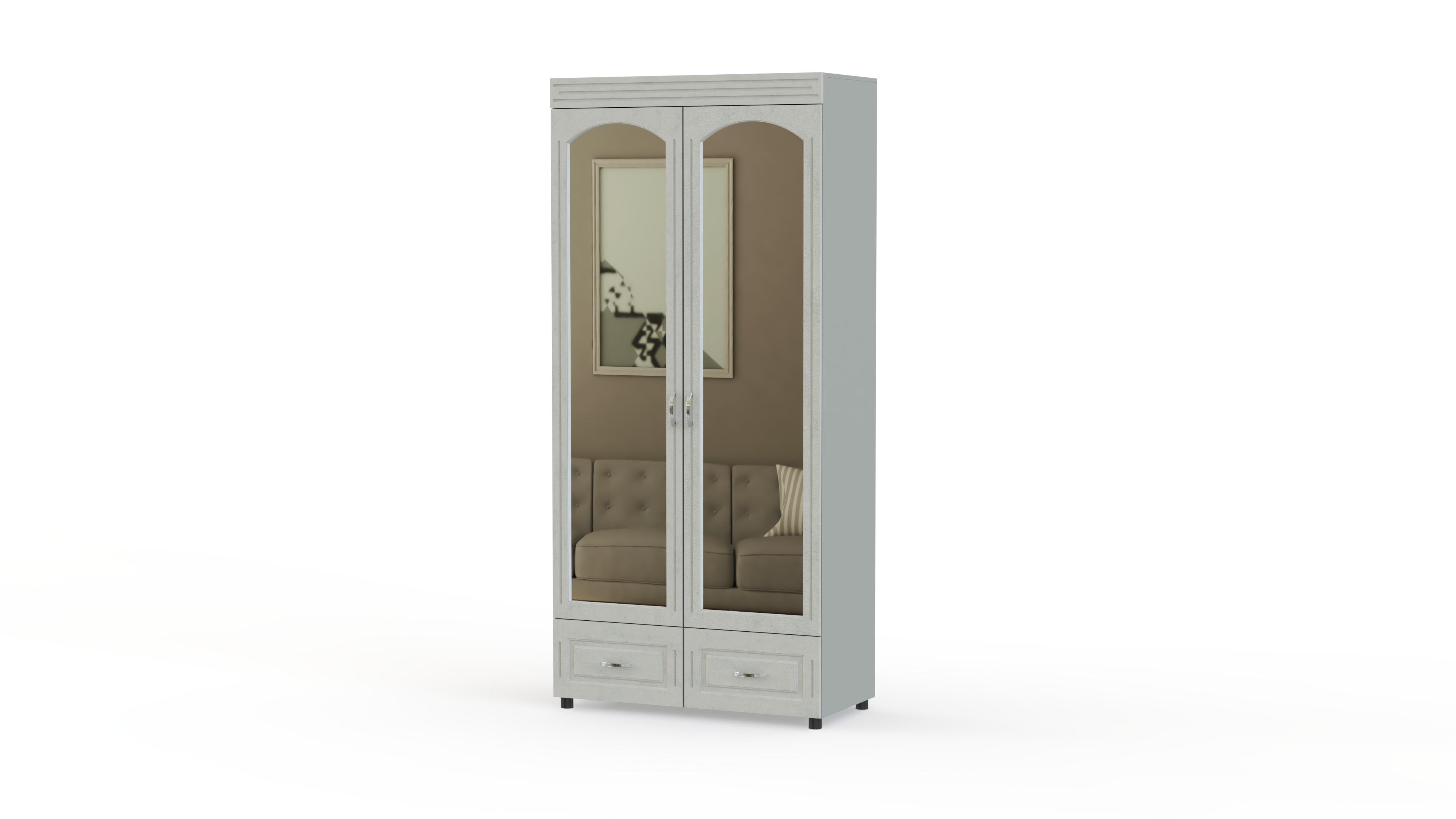 Элегантный классический комплект для спальни Элизабет Композиция 3 BMS, выполненный в светлых тонах, выглядит особенно легко и атмосферно и станет в интерьере вашего дома стильным акцентом. В гарнитур входят платяной шкаф с изящными полукруглыми зеркалами, туалетный столик с навесным широким зеркалом, удобная двуспальная кровать и две прикроватные тумбы. Фасады мебели декорированы металлическими, под позолоту, оригинальными ручками, придающими всему комплекту винтажный оттенок.