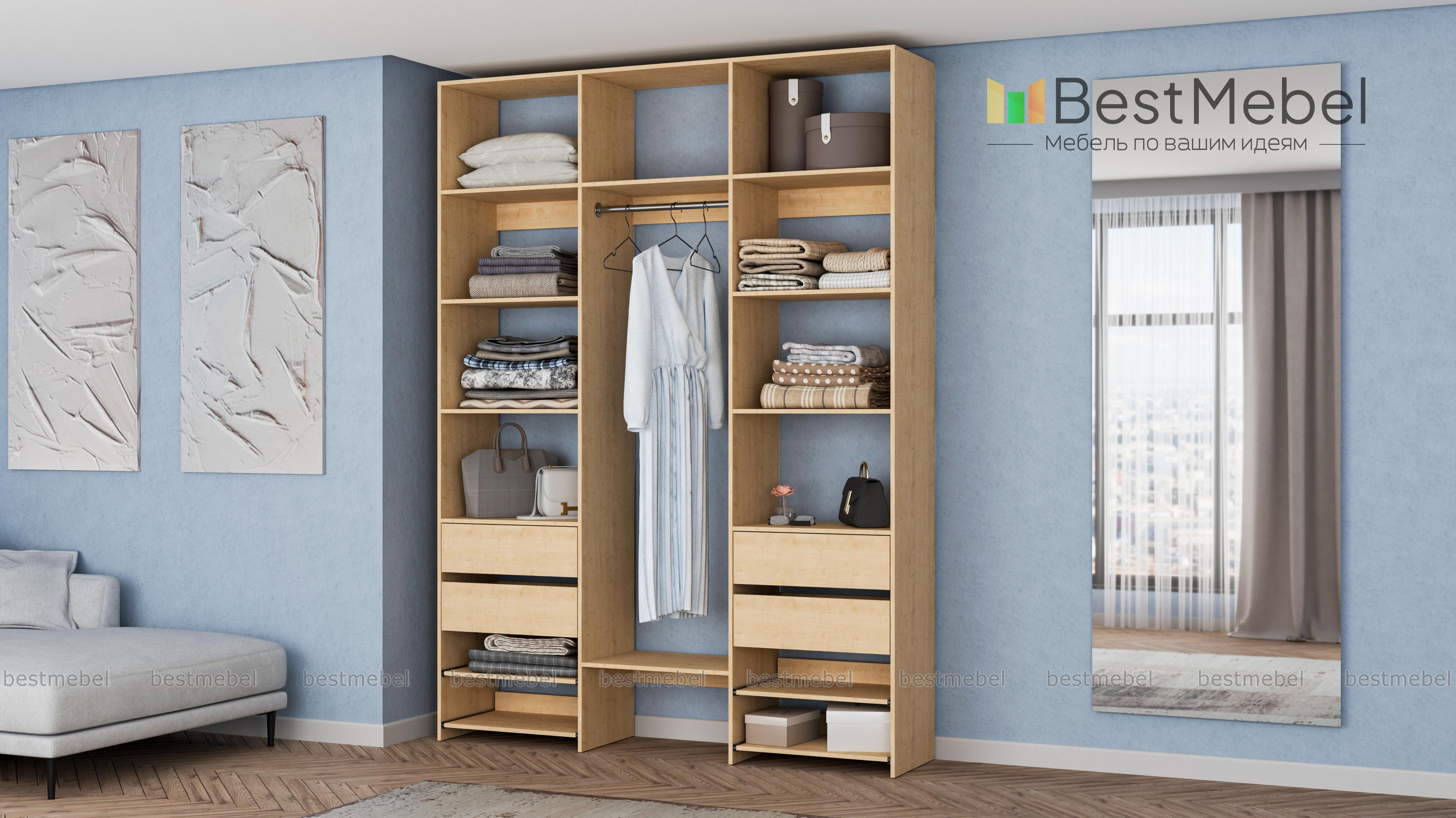Стеллаж для одежды Мирта 94 BMS сделает удобным хранение различных предметов гардероба. Легко доставать вещи помогут вам открытые боковые и верхние секции, платяная штанга, две пары ящиков и выдвижные панели. Ламинированная плита в природном оттенке — экологичный современный материал, выдерживающий значительные нагрузки. Купить стеллаж для одежды Мирта 94 BMS вы сможете в нашем интернет-магазине, подобрав размеры и гармонирующий с вашим интерьером оттенок.