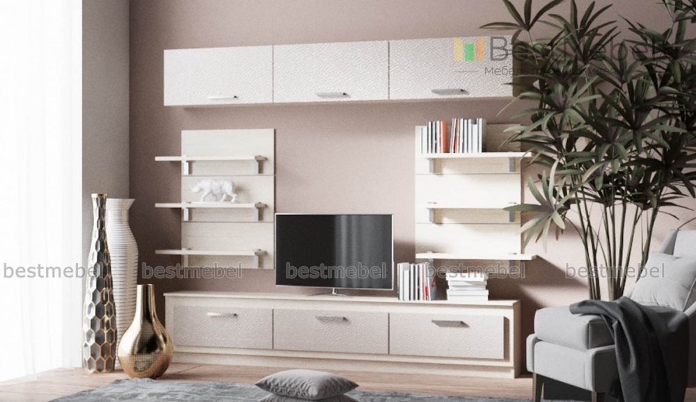 Модульная гостиная Александрия-6 BMS станет универсальным решением для просторных и малогабаритных помещений. Практичная конструкция из отдельных модулей, легко комбинирующихся друг с другом, позволит органично вписать гостиную в помещения любой планировки. В комплекте широкая низкая тумба под ТВ, навесные шкафчики с откидными дверцами и открытые полки для книг и интерьерных украшений. Фасады древесных тонов декорированы вставками с имитацией кожи. Купить модульную гостиную Александрия-6 BMS приглашаем по доступной цене в наш интернет-магазин.