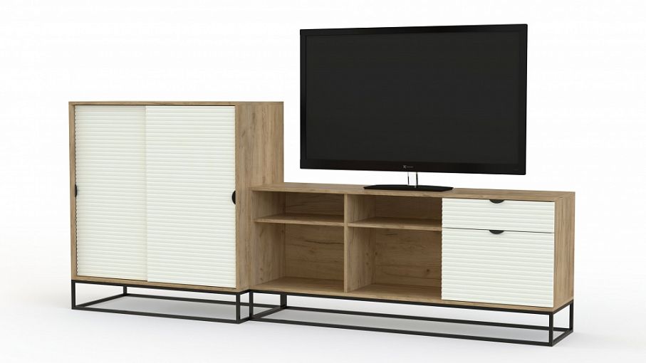 Стенка Пиксель 20 BMS состоит из широкой низкой тумбы под аппаратуру и универсальной тумбы с дверцами-купе. Мини-композиция в стиле лофт подойдет для оформления телезоны в небольшой современной гостиной. Наличие открытых секций, глухих отделений с фактурными фасадами и выдвижных ящиков позволяет удобно и эстетично разместить телевизионные аксессуары, книги, всевозможные бытовые вещи и модный декор. Купить стенку Пиксель 20 BMS приглашаем в наш интернет-магазин, подобрав оптимальные размеры.