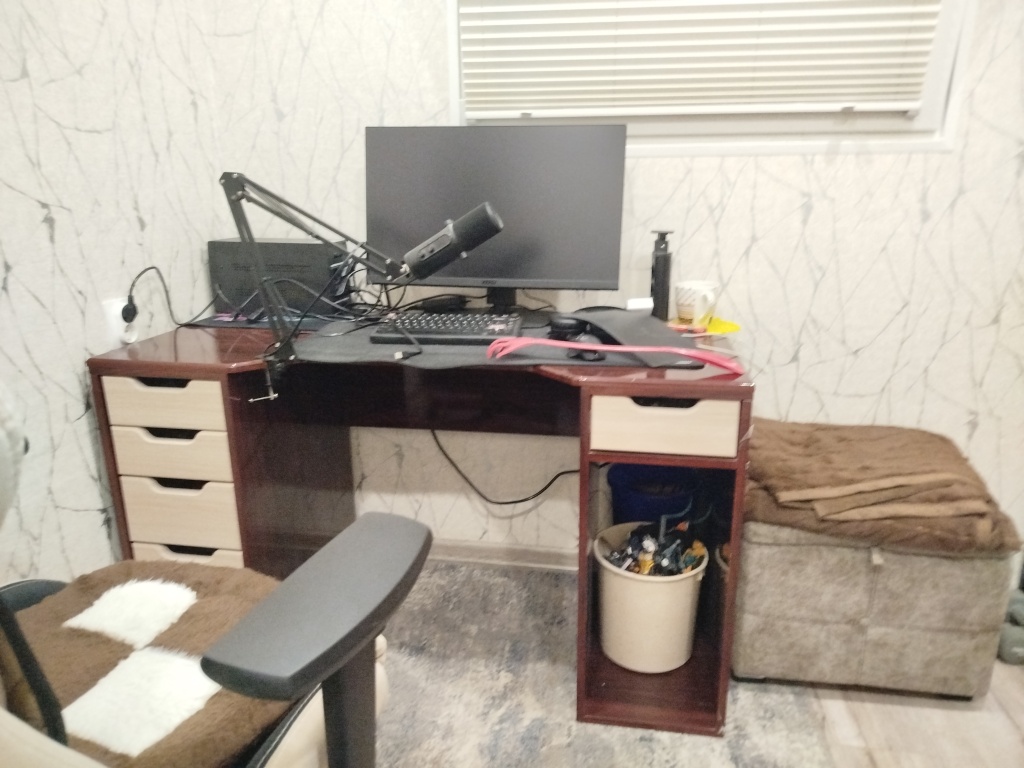 Заказ №786855Отличный компьютерный стол, прочный, не сыпется. Неприятного запаха не имеет. На нем свободно размещается все что необходимо для работы. Так же порадовало количество ящиков и то что они вместительные