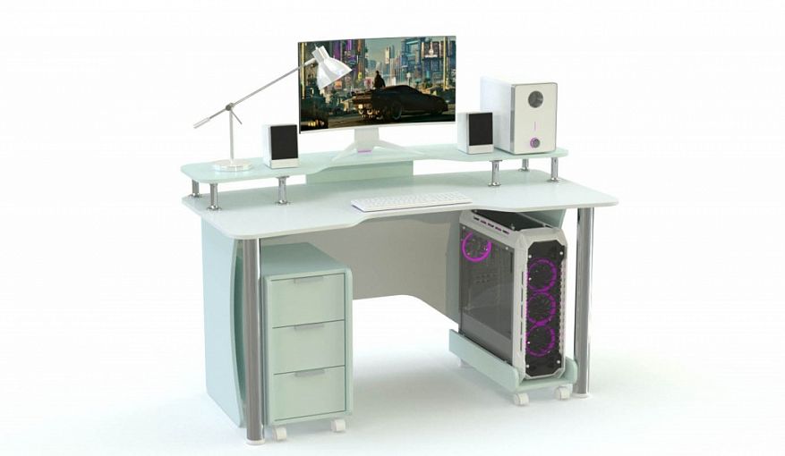 Игровой стол Афина-8 BMS станет практичным выбором для небольших помещений. Безопасно скругленная по углам, модель выполнена в сочетании белого и серого, угловые опоры из ЛДСП дополнены регулируемыми хромированными. С комфортом расположиться во время продолжительной игровой сессии и компактно разместить технику и рабочие материалы помогут эргономично вырезанная столешница с надстройкой, мобильная тумба и подкатная подставка для системного блока. Купить игровой стол Афина-8 BMS приглашаем в наш интернет-магазин.