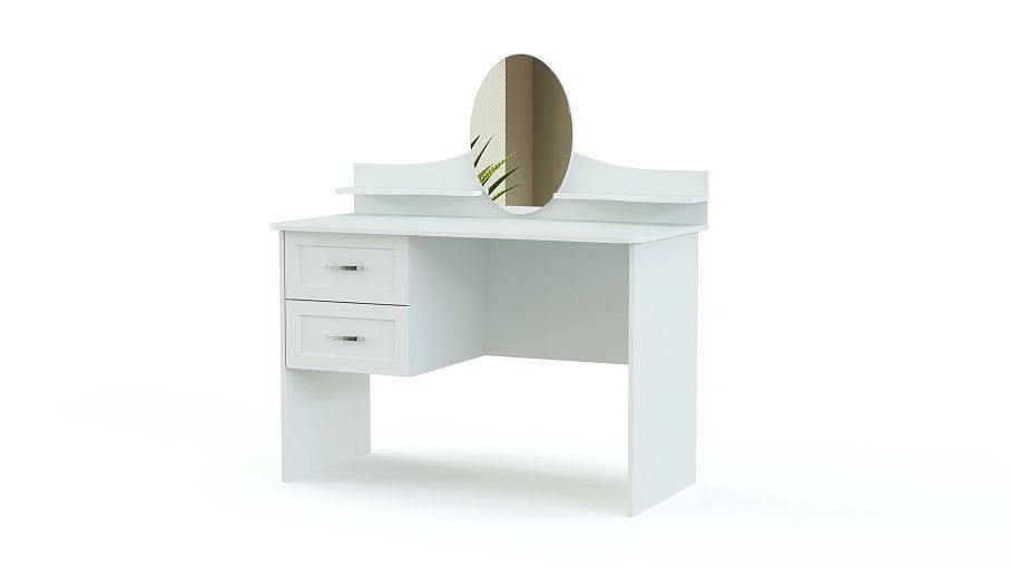 Элегантный классический столик для уютной спальни в стиле прованс. Модель обладает характерными для мебели этого типа плавными изгибами, богатым декором фасадов и выполняется в светлых тонах. Для украшений и парфюмерных флаконов по бокам небольшого овального зеркала располагаются две изящные полочки, углы широкой столешницы безопасно скруглены. Хранить под рукой необходимые вещи будет просто с выдвижными вместительными ящиками. Туалетный столик Шери BMS непременно порадует вас и доступной ценой.