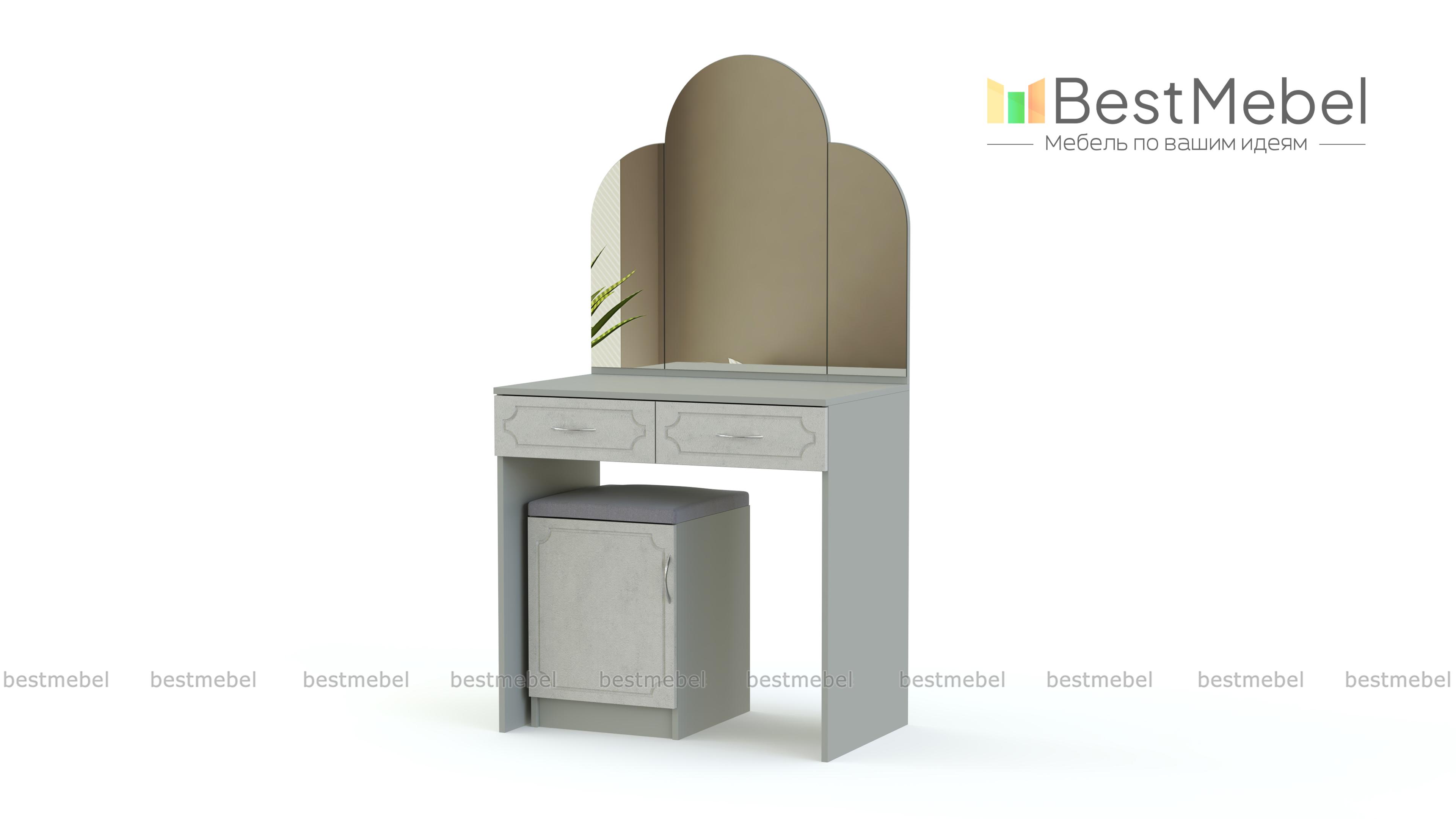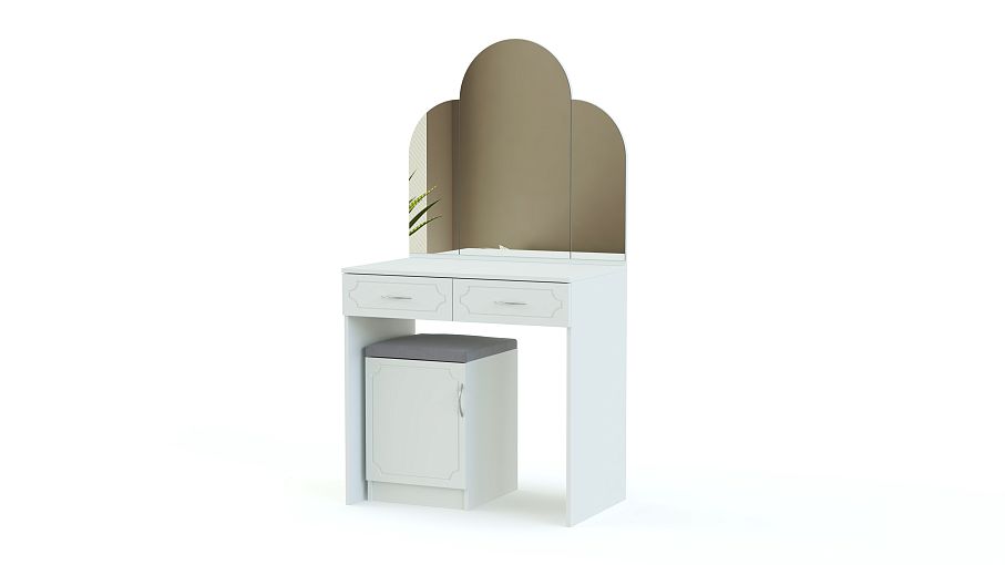 Туалетный столик Золушка BMS станет украшением спальни в классическом стиле. Прямой столик с трехстворчатым, фигурно вырезанным зеркалом, дополнен многофункциональной тумбой с мягким сиденьем, которая играет роль пуфа. Белоснежные фасады двух выдвижных ящиков и тумбы декорированы изящной рамочной фрезеровкой, эффектно сочетаясь с натуральными оттенками корпуса. Купить туалетный столик Золушка BMS для комфортного ухода за собой вы сможете в нашем интернет-магазине.