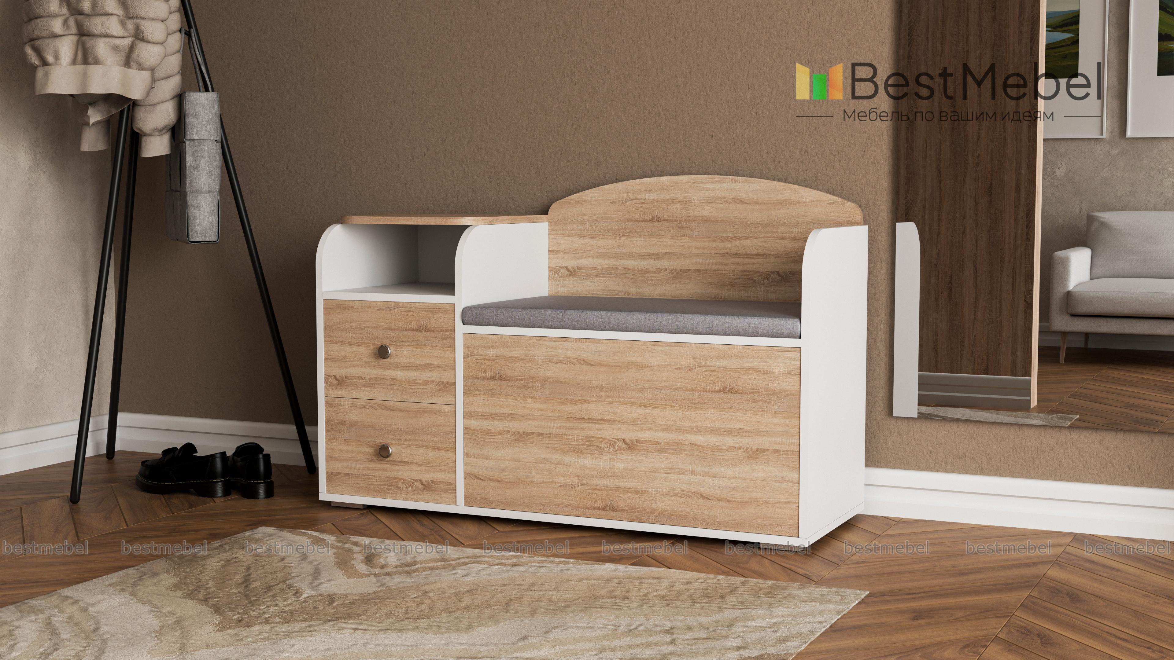 Тумба для обуви классная.Очень симпатично смотрится. Удобная и вместительная.Сидушка мягкая экокожа светлая.