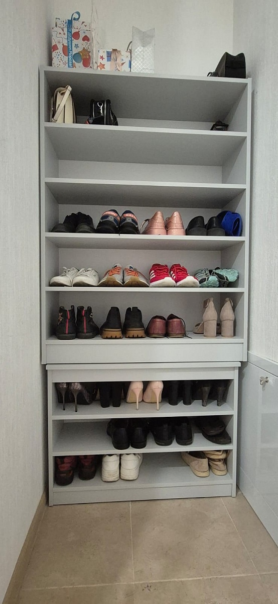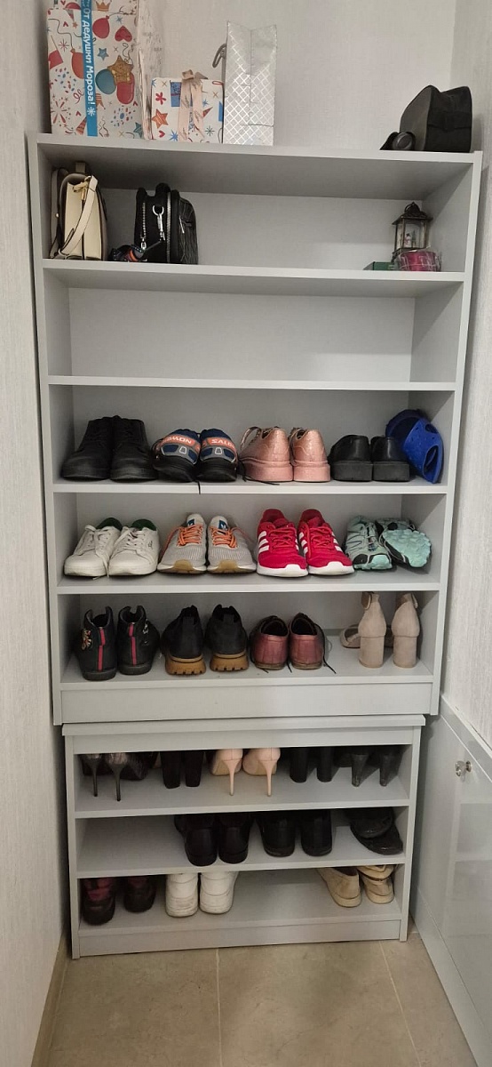 Покупали стеллаж и тумбу, чтобы собрать обувницу из них. На фото результат. Понравилось, что цена доступная, при этом внешний вид товара очень даже хороший. Доставка 4-5 дней, даже если под заказ по нашим размерам. Заранее согласовывают эскиз с вами, то есть вы уверены, что приедет тот товар, что вы и планировали. При сборке немного были сколы, но не критично и незаметно. Из минусов – стеллаж хотели повесить на стену, но крепления к стене очень тонкие у производителя и поэтому мы просто прикрепили к стене (верхний стеллаж), чтобы не упал. Сейчас ещё и комод заказали у БестМебель.  Заказ №1091215