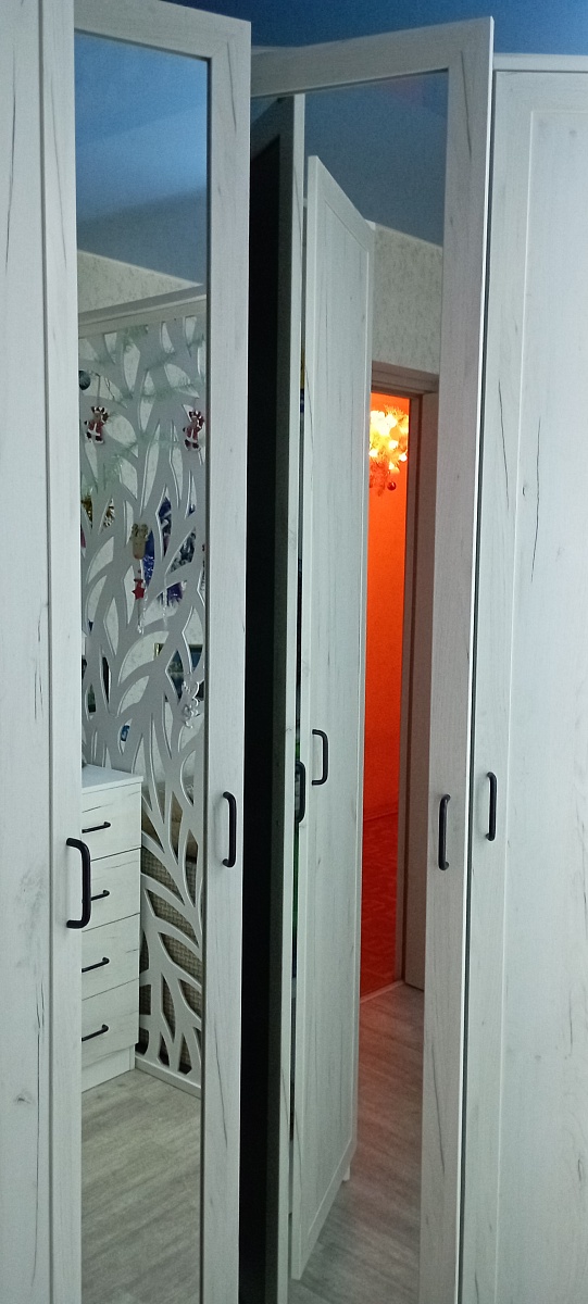 Заказ № 00000849901. Заказали шкаф размером 3000*2200*50. Выбрали расцветку сочетающуюся с комодом с этого же сайта. Ручек таких же как у комода в предложенных вариантах не было, но нам пошли навстречу и прислали именно их. Огромное спасибо за это. Собирали сами. Инструкция мелковата, но разобрались. По итогу получились 1 угловой шкаф и 3 пенала которые потом скрепили друг с другом стяжками, но при желании их можно ставить и отдельно друг от друга. Шкафы довольно вместительные. Качество зеркал хорошее, 2 дверцы шкафа состоят из зеркал в рамках. В общем шкаф замечательный.