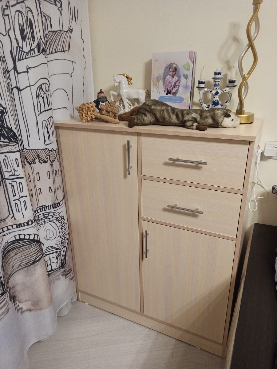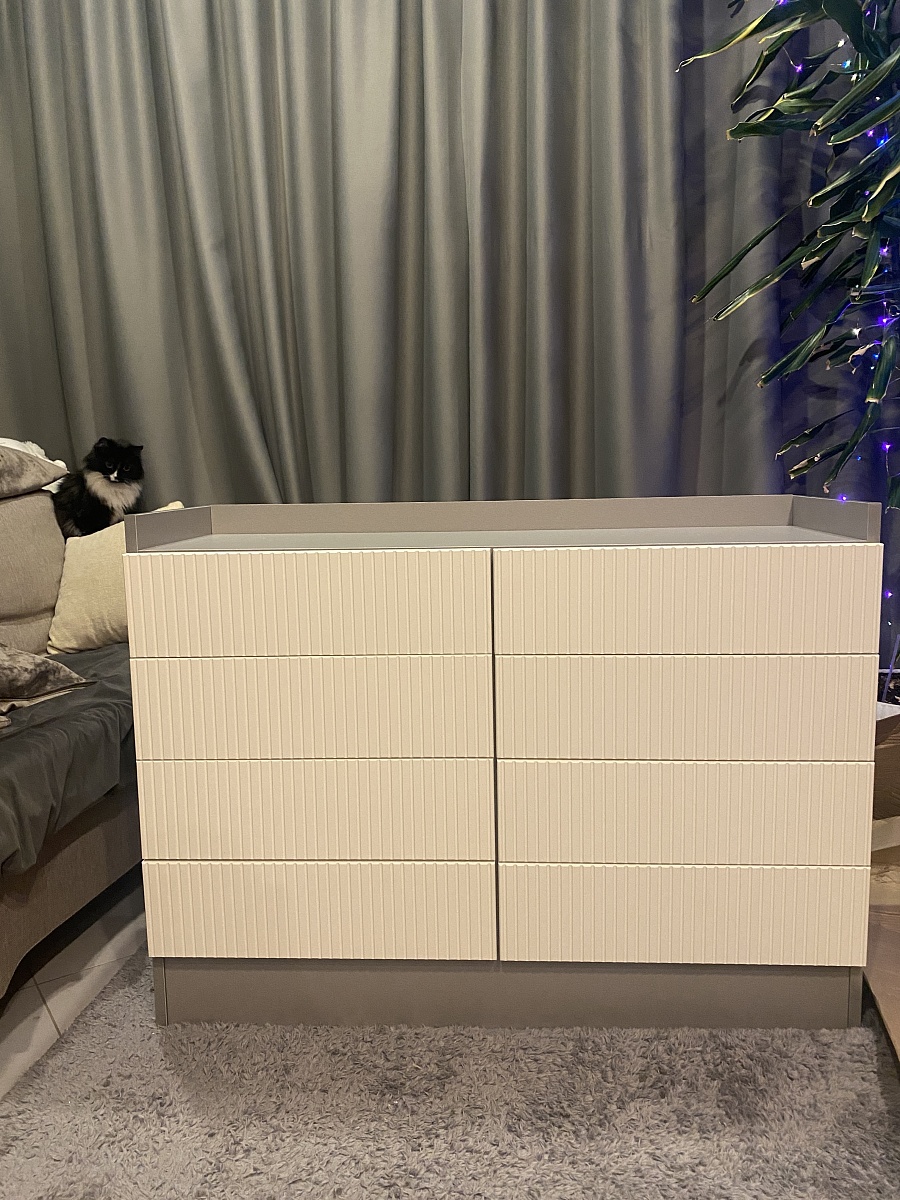 Заказ № 00000848580Комод классный, за свою цену вообще. Очень вместительный и удобный, направляющие шариковые хорошие, ящики выкатываются полностью, что тоже удобно. Ручки устанавливали сами, свои. Заказывала без ручек. Размеры комода немного меняли.