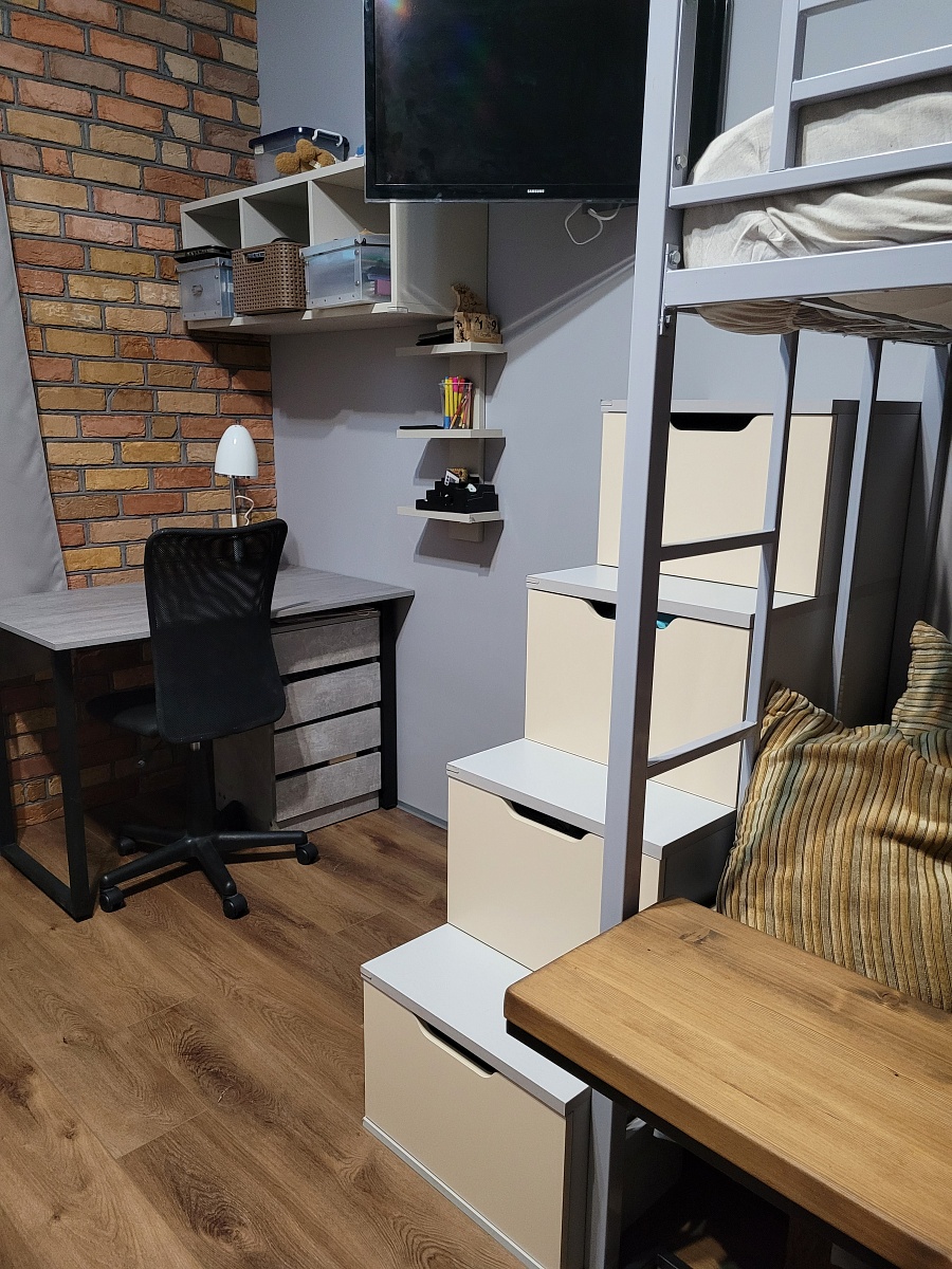Заказывала две штуки для детских кроватей-чердак. По функционалу лучше этой модели, на просторах интернета,  я не нашла. Здесь же настолько интересной мне показалась модель, что остановилась на ней. Сборка оказалась не самой простой, т.к. много ящиков надо было собрать, да ещё и умножить все старания на два. Из положительных моментов - на изготовление ушло совсем не много времени, без возрастания цены сделано усиление платформ за счёт толщины древесной плиты( у нас лестницы для подростков с 42 размером стоп и 60+ кг), все составляющие без брака и на каждой единице составляющей стоит номер, благодаря которому, весь этот конструктор хорошо собирается. Что хочется посоветовать для покупателей - заказывайте хотя бы минимальную фаску для деталей лестницы- комода, иначе заметите, какие острые края и углы будут у изделия. Мне сразу захотелось поставить силиконовые уголки. Ведь это и тактильно слишком остро и сколы могут образоваться в дальнейшем на этих тревожных местах. И производителю - может стоит добавить ещё одну ступень(ящик) с фасада. Ведь такой разбег получается большой для стандартной высоты и, соответственно, ящики тяжеловаты. Вот с торца ящики просто прекрасны. И ход вперёд у них лёгкий и задумка замечательная - столько полезного места задействовано. В целом изделие рекомендую, как и производителя.