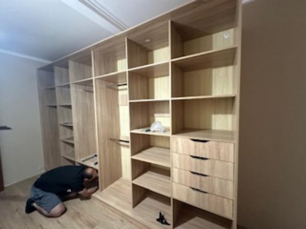 Заказывала шкаф купе по подобию этой гардеробной, в другом цвете и немного изменены внутренности. Шкаф классный, небольшие нюансы- если у вас вдруг кривой пол как у нас (на ширине шкафа в 3,6 это сильно заметно), то задние стенки ровно не встанут в пазы) нужно имитировать ровный пол и тем самым ровно закрепятся стенки. А также не было каких то необходимых отверстий в боковых стенках, пришлось самим. А так в целом все хорошо.