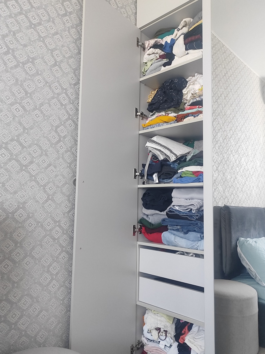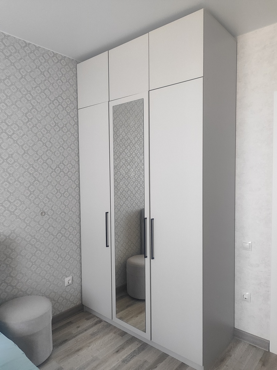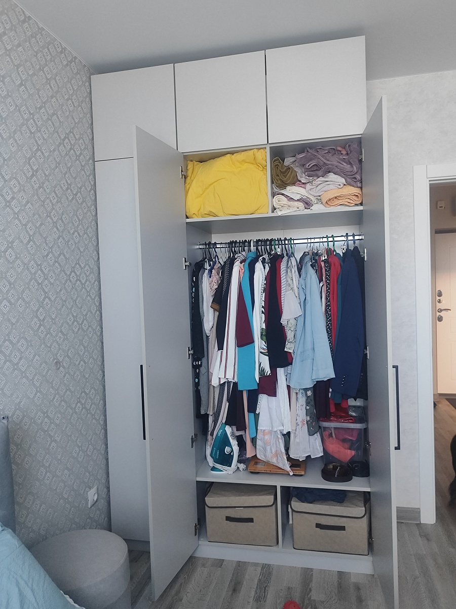Заказ 00000989902. Шкаф "Остин Нео 16 BMS" мы брали в спальню, чтобы навести порядок с одеждой. Первое, что понравилось – возможность выбрать цвет. Взяли серый – смотрится очень стильно и современно, именно такой нейтральный, но не скучный оттенок, который мы искали. Черные ручки стали отличным контрастным акцентом, завершили вид. Сам дизайн действительно минималистичный и аккуратный, не перегружает пространство.Функционально шкаф оказался удобным. Три двери – хороший размах. Отделение для вешалок вместило все платья и костюмы, полки отлично подошли для футболок, свитеров и постельного белья. Распашная антресоль вверху – спасение для чемоданов и сезонных вещей, которые не нужны каждый день. Зеркало на центральной дверце – просто бомба! Очень удобно видеть себя в полный рост перед выходом, не бегая по квартире. И правда создает ощущение, что комната чуть больше.Но сборка... Сборка была испытанием.Деталей много, и самое сложное – установить вертикальные стенки (боковины и центральную перегородку) в одиночку. Это просто нереально. Они большие, тяжелые, их нужно держать строго вертикально и одновременно прикручивать. Без помощника тут никак, мы еле справились вдвоем. Еще один момент – петли. Их несколько типов (для обычных дверей и для зеркальной), и в инструкции не сразу понятно, какие куда. Пришлось искать видео сборки в интернете, чтобы разобраться – без него наверняка перепутали бы. Будьте готовы к этому этапу.Если вам нужен компактный, но вместительный шкаф с современным дизайном и полным зеркалом, и вы готовы к сборке (обязательно с помощником и, возможно, с обучающим видео под рукой), то "Остин Нео" – отличный вариант. Смотрится дороже своей цены, и теперь вся одежда наконец-то прибрана!
