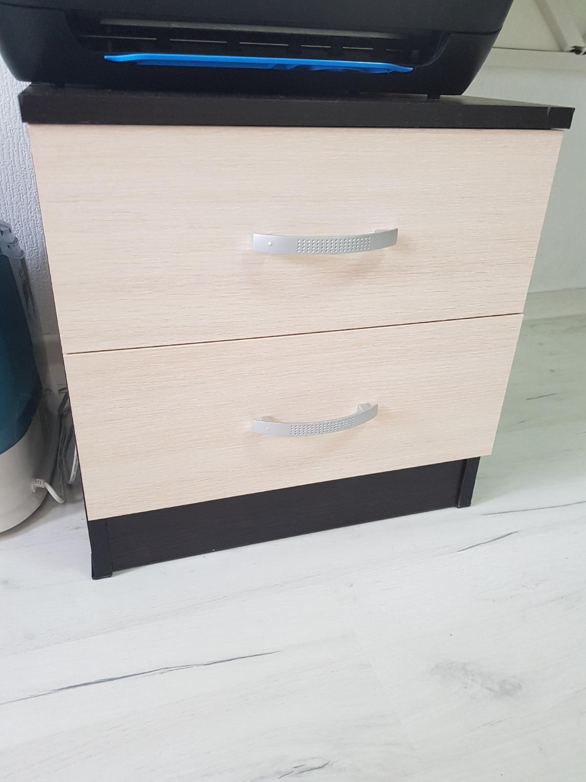 Шкаф нас удивил. Он оказался длинным и тонким (НЕ таким широким и коротким как на ваших картинках). Матового стекла в нем тоже нет. Он весь деревянный (или что там за материал). Мы думали хранить в нем папки, но они, конечно же, НЕ везли. В итоге мы приспособили его под детские вещи и, в целом, довольны. Смотрится стильно, как видите на фото (сверху лежит рамочка, не обращайте внимания). Убираться очень удобно, когда мебель висит. Благодаря вашей компании столы у нас тоже навесные и мы счастливы)