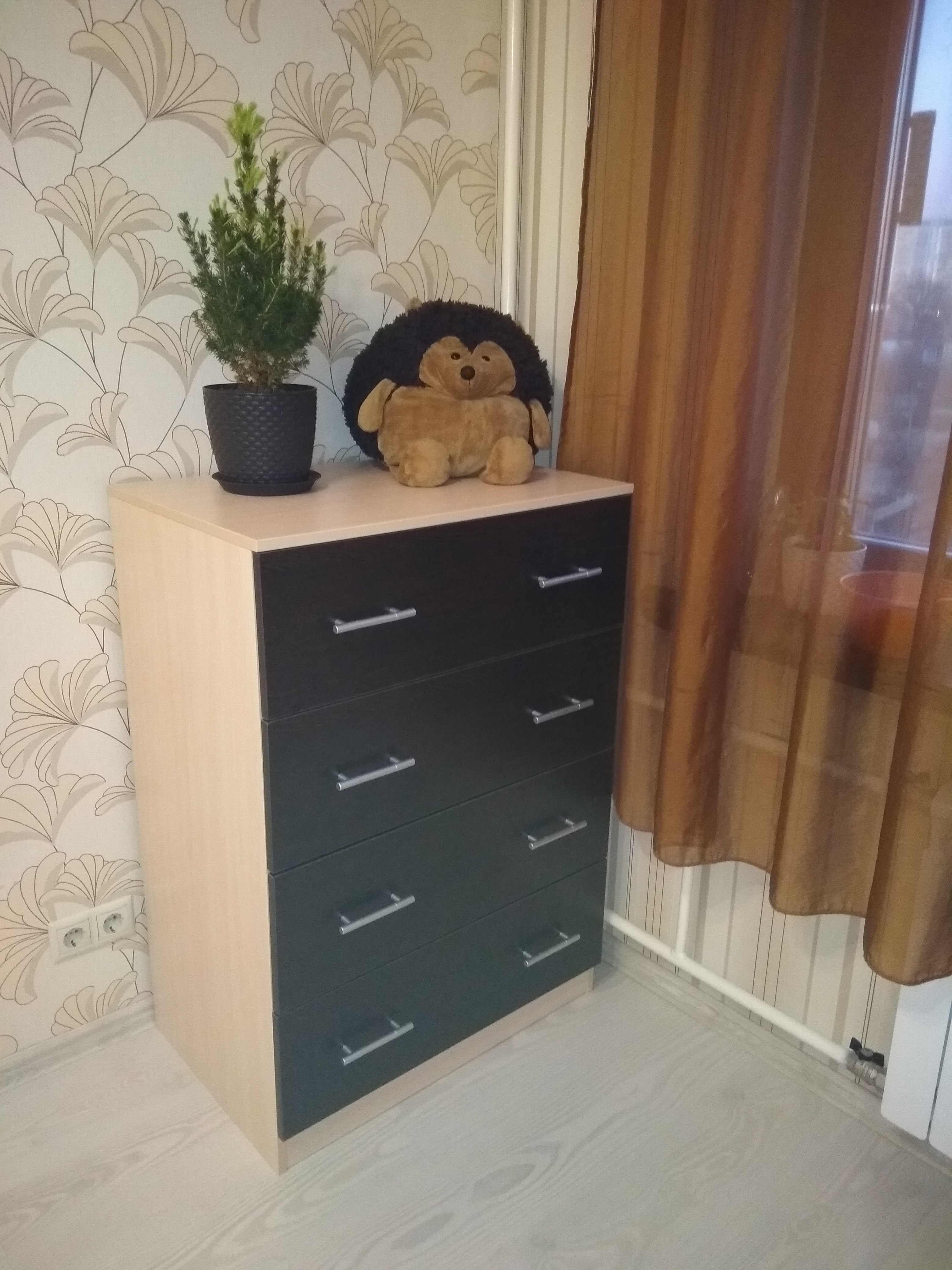 Комодом довольны. Отлично смотрится. С доставкой были проблемы. Но всё-таки все привезли и собрали. Почему-то очень много в упаковках стружки. На каждой детали наклейка, которую приходится отдирать, а потом ещё и клеевой слой удалять (благо что есть уайт-спирит). После сборки приходится все конкретно оттирать и отмывать. Очень порадовало, что довольно большой диапазон выбора размеров. Комод заказали с утолщенной кромкой и шариковыми направляющими. Утолщенная кромка отлично смотрится (по сравнению с обычной, которая была на тумбочке, идущей в подарок к этому заказу).