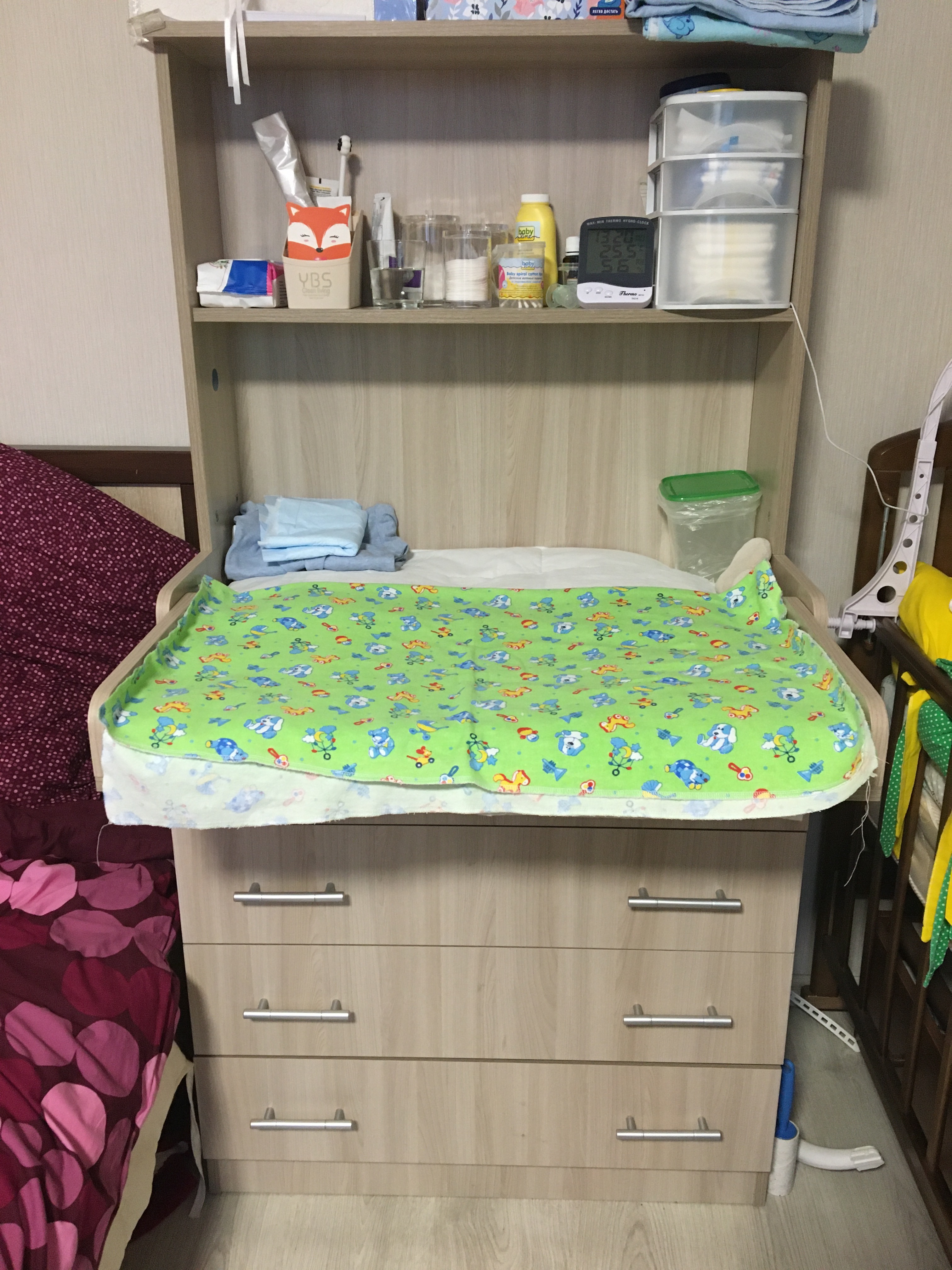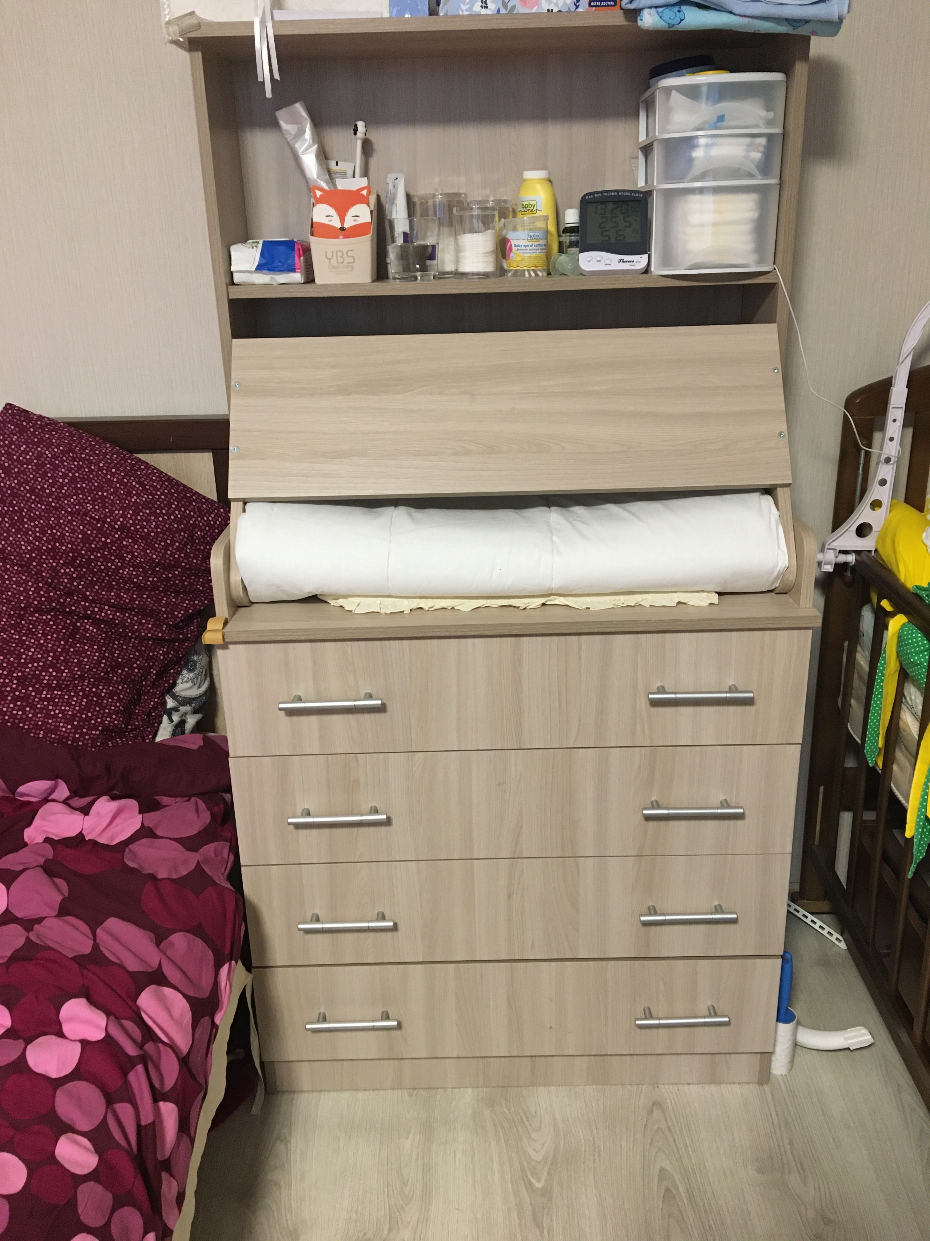 Очень удобный комод!!!! Большая пеленалка, вместительные ящики, а наличие полок это просто спасение! Иначе малыш все тащил бы себе в рот! Рекомендую! Очень удобный!!!