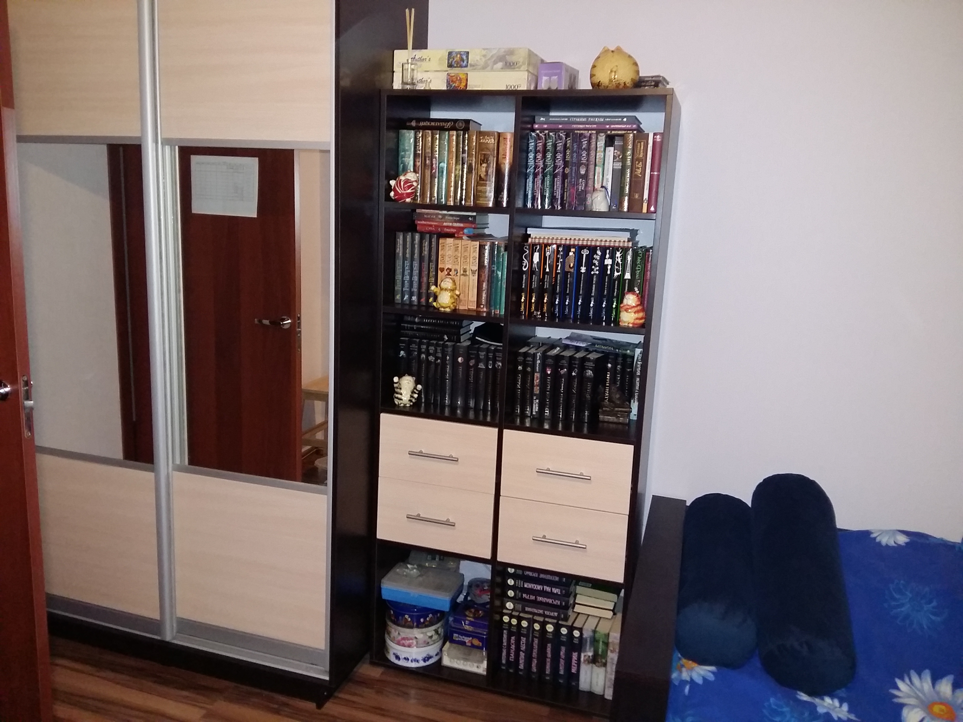 Долго подбирала подходящий стеллаж для любимых книг, этот понравился выдвижными ящиками, где можно хранить всякую всячину чтобы не была не виду, очень удобно, книги спокойно встают в два ряда на полке, по размерам мне подошел, как говорится тютелька в тютельку) Особо приятно что при изготовлении учли мои пожелания, а именно чтобы нижняя самая полка была повыше, т.к. там на стене расположена розетка, к которой даже через стеллаж есть доступ.