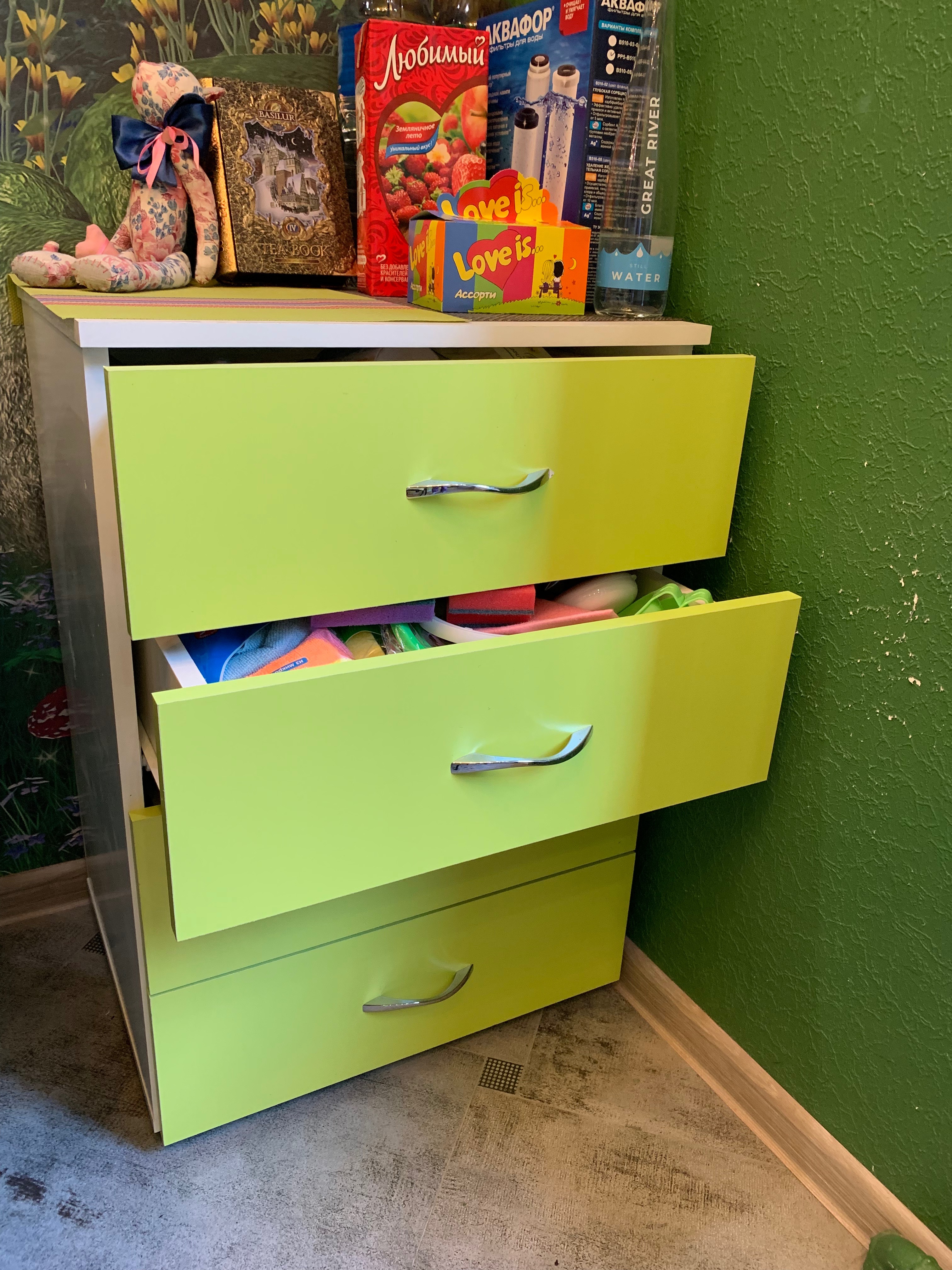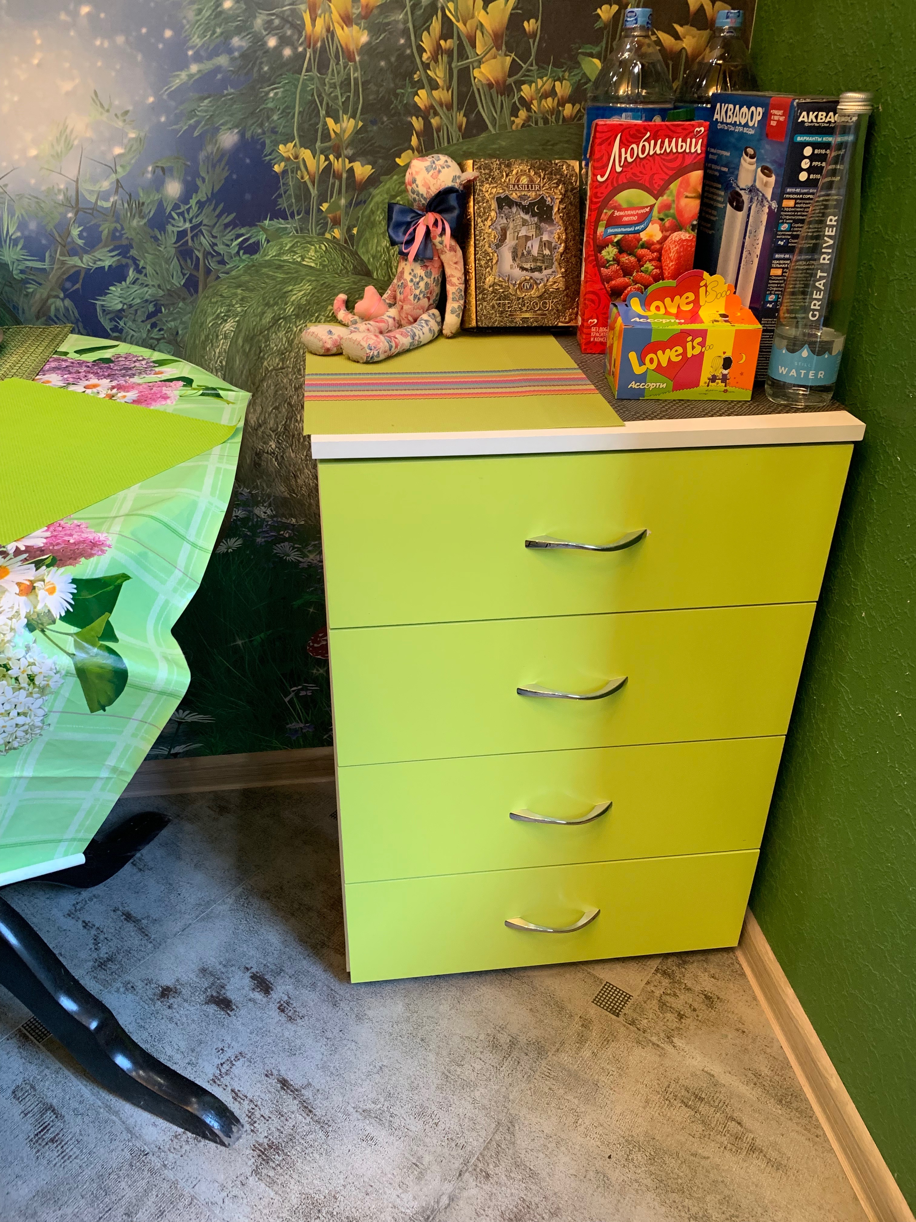 на кухню нужен был небольшой комод, узкий, но с 4мя ящиками и глубокий. Фасад - цвет лайм. Это единственный магазин, где можно было выбрать необходимый сложный цвет прямо на сайте, подобрать фурнитуру. какую душе угодно. Комод доставили в ценности и сохранности. очень довольна магазином