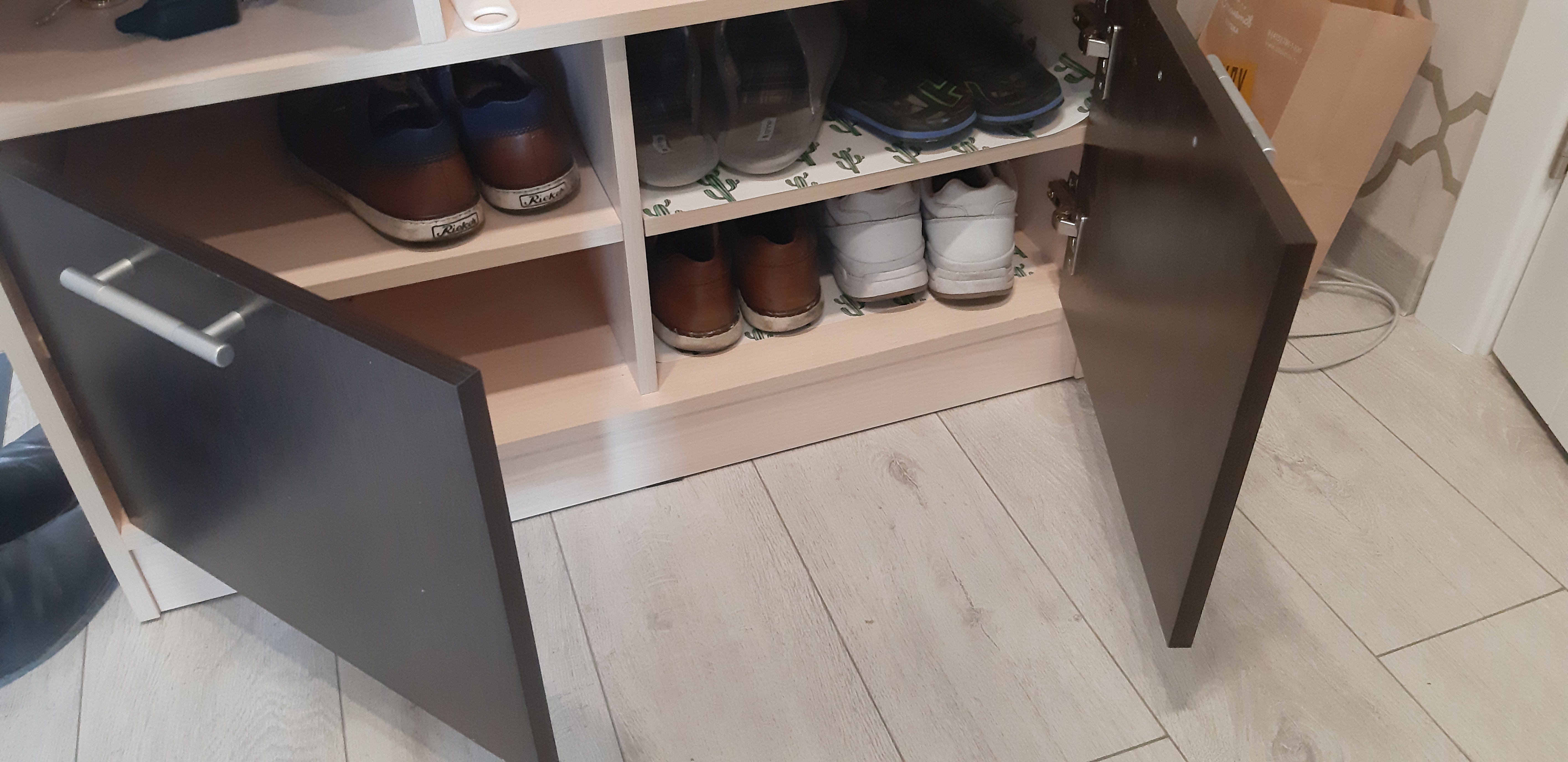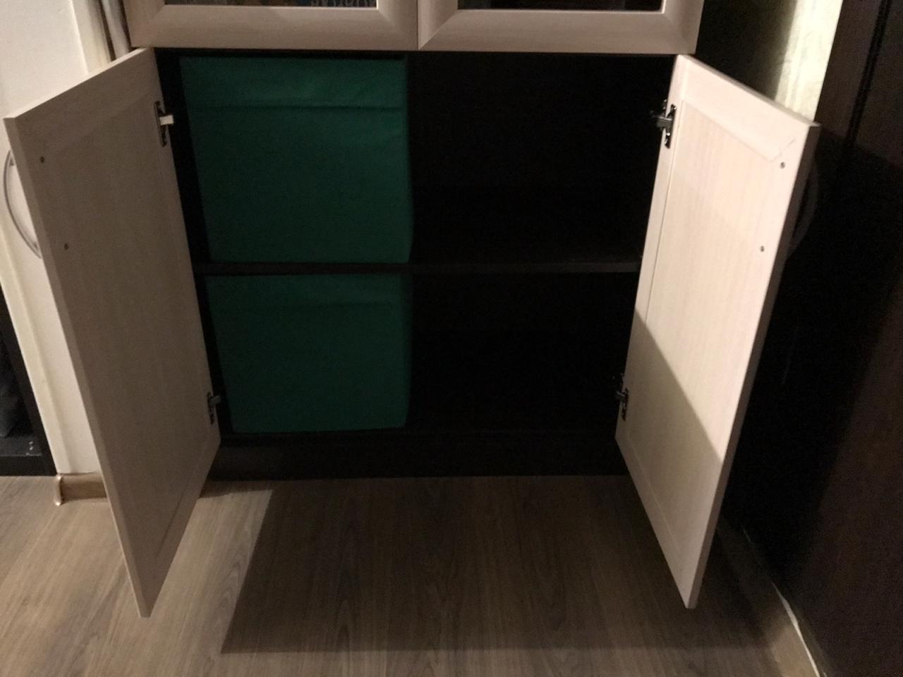 Отличная тумба для прихожей, в которой легко разместится большое количество обуви, которое будет прекрасно располагаться на специальных полочках. Единственное, что немного смутило - открывание створок производится на себя (было бы гораздо удобнее, чтобы створки открывались сверху вниз). По акции в БМШ такую тумбу можно приобрести даже за 1 рубль при выполнении определенных условий.