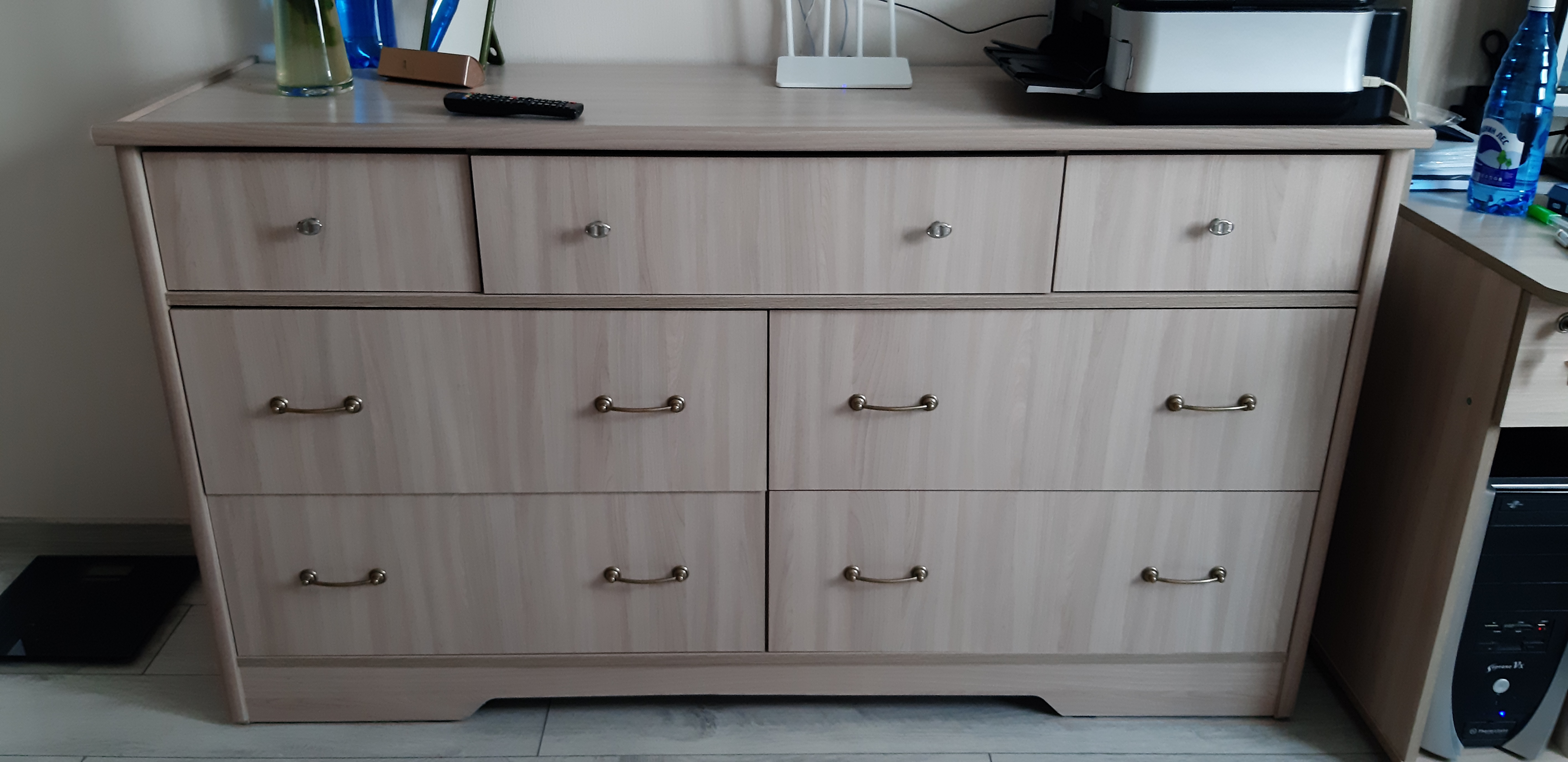 Отличный комод, в который без труда поместится и обычное белье, и постельное белье, и косметика. Выдвижные ящики (в отличие от открывных) позволяют без труда добраться до любой вещи, которая в нем хранится. Декоративные реечки на верхней части комода и на боковинах добавляют элегантности и легкости этому комоду (несмотря на его внушительные размеры).